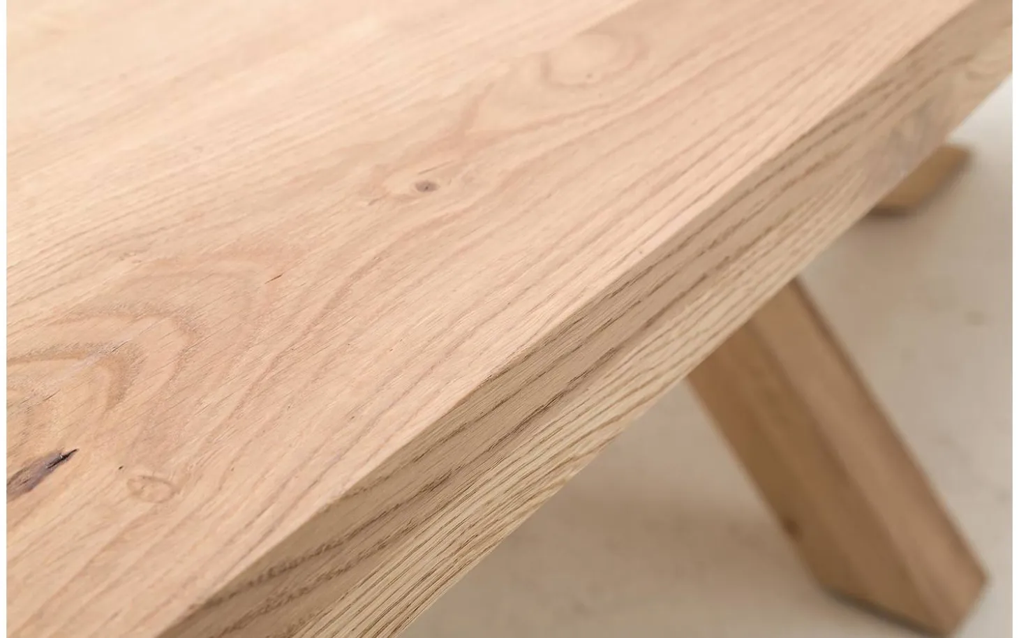 Das besondere Kreuzgestell-Untergestell ist aus demselben hellen Eichenholz wie die Platte gefertigt. Diese spezielle Beinkonstruktion sorgt nicht nur für Stabilität, sondern ist auch ein echtes Statement in Ihrem Esszimmer.
