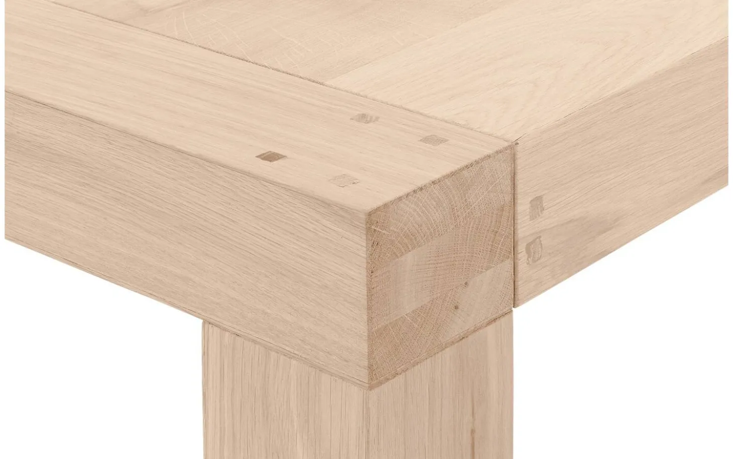 Die Tischplatte ist aus stabilem Eichenholz mit einer Soft-Touch-Lack-Oberfläche gefertigt. Diese schützende Lackschicht hält die matte Ausstrahlung intakt, während die Holzmaserung sichtbar und fühlbar bleibt. Die hellen Äste im Holz sorgen für einen authentischen Charakter.