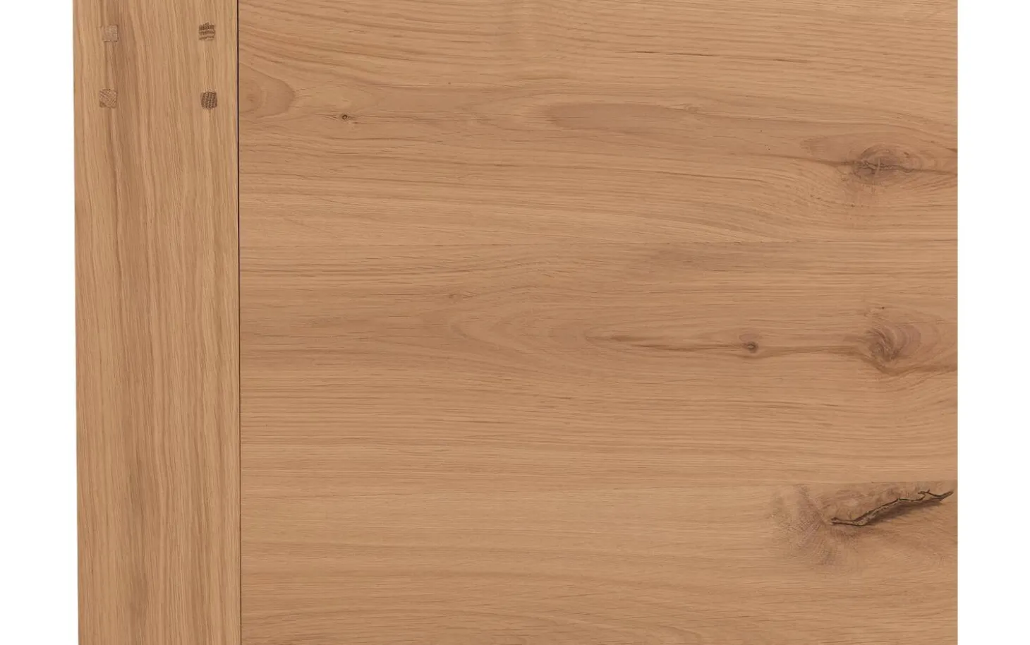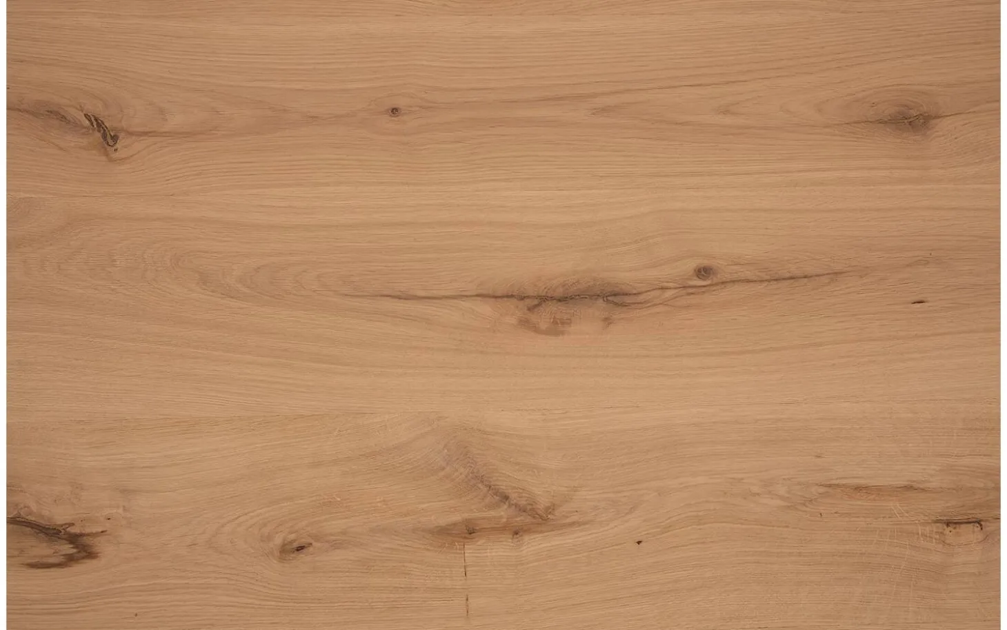 Die Tischplatte aus massivem Eichenholz ist mit Soft-Touch-Lack behandelt, wodurch die natürliche Maserung sichtbar und fühlbar bleibt. Diese Veredelung schützt vor Flecken und Kratzern, während das Holz seinen authentischen Charakter behält.