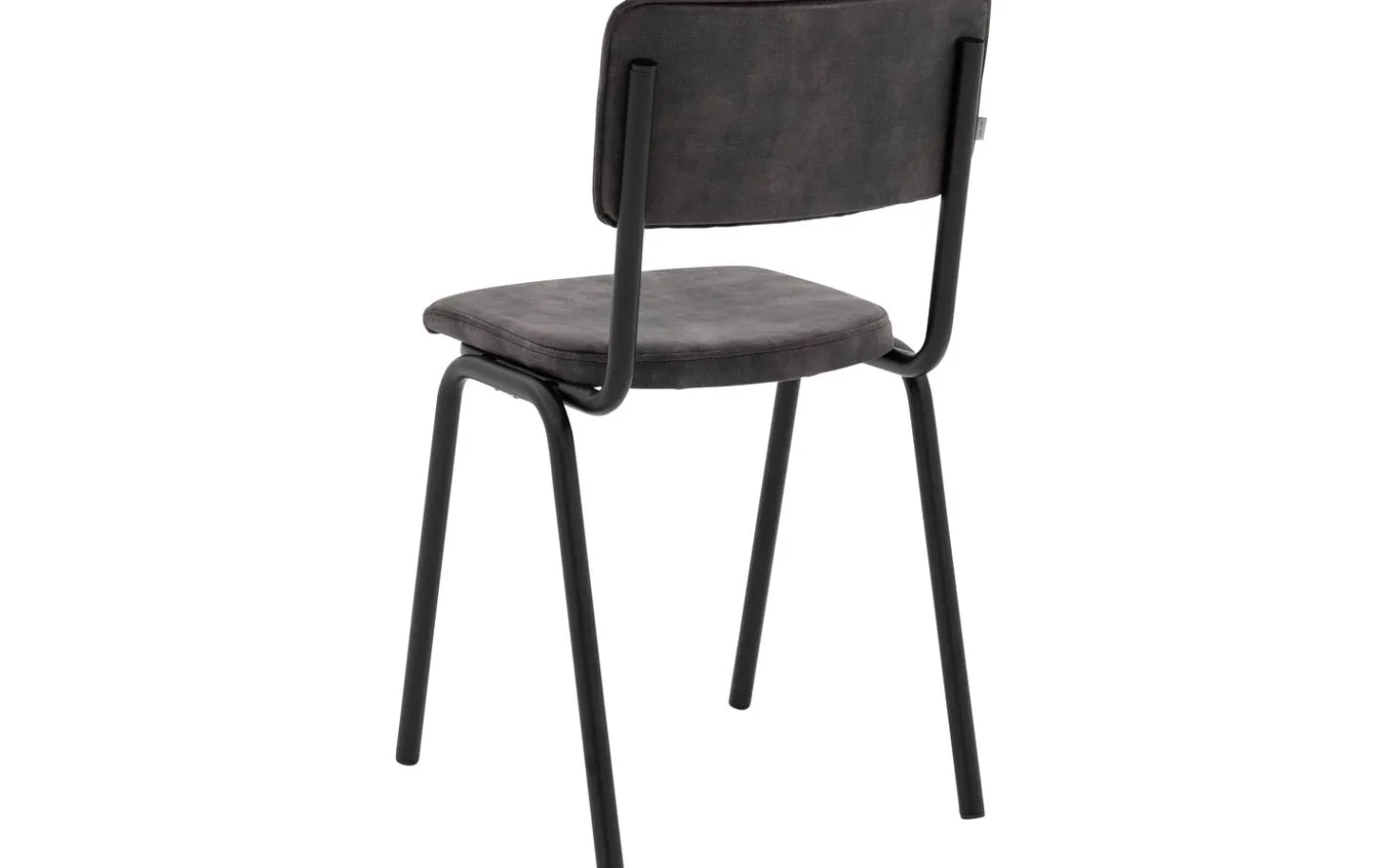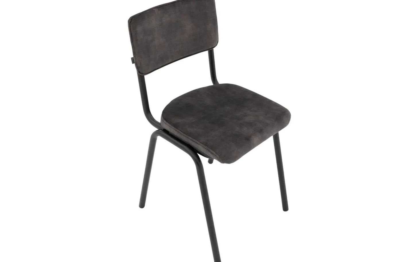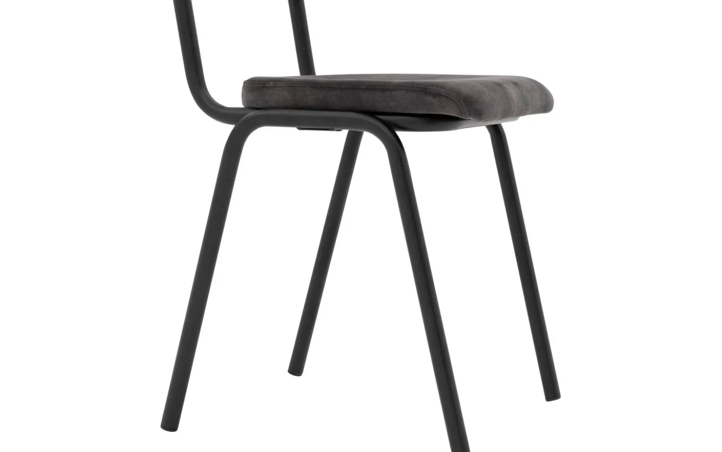 Das schwarze matte Gestell bildet einen schönen Kontrast zur grauen Polsterung und verleiht dem Stuhl einen robusten, industriellen Touch. Ohne Armlehnen nimmt dieser Esszimmerstuhl wenig Platz ein, ideal für kleinere Essbereiche oder wenn Sie mehr Stühle um Ihren Esstisch stellen möchten.