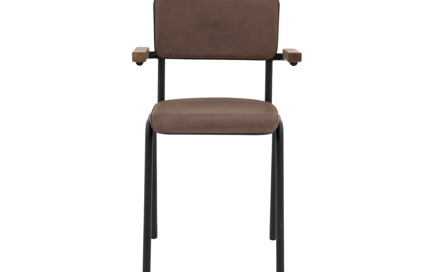 Der braune Esszimmerstuhl Chaplin aus Leder mit Armlehne kombiniert Retro-Design mit modernem Komfort. Dieser Stuhl erinnert an einen klassischen Schulstuhl, jedoch in einem stilvollen neuen Gewand. Mit einer festen Sitzfläche und hochwertiger Schaumstoffpolsterung sitzt man aktiv und bequem am Tisch. Das Outdoor-Leder verleiht dem Stuhl eine wunderschöne Vintage-Optik, die mit den Jahren nur noch schöner wird.