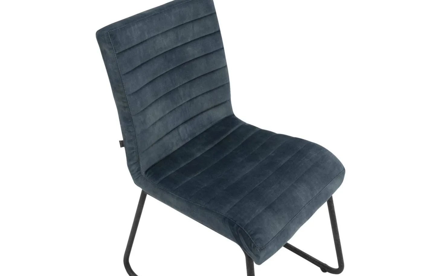 Bekijk eetkamerstoel Dax in een mooie blauwe velours bekleding. Deze blauwe eetkamerstoel zonder armleuning combineert een strakke vormgeving met fijn zitcomfort. De zachte velours stof geeft de stoel een warme en eigentijdse uitstraling, terwijl het zwarte metalen onderstel zorgt voor een stoer accent. Een fijne toevoeging aan je eetkamer!