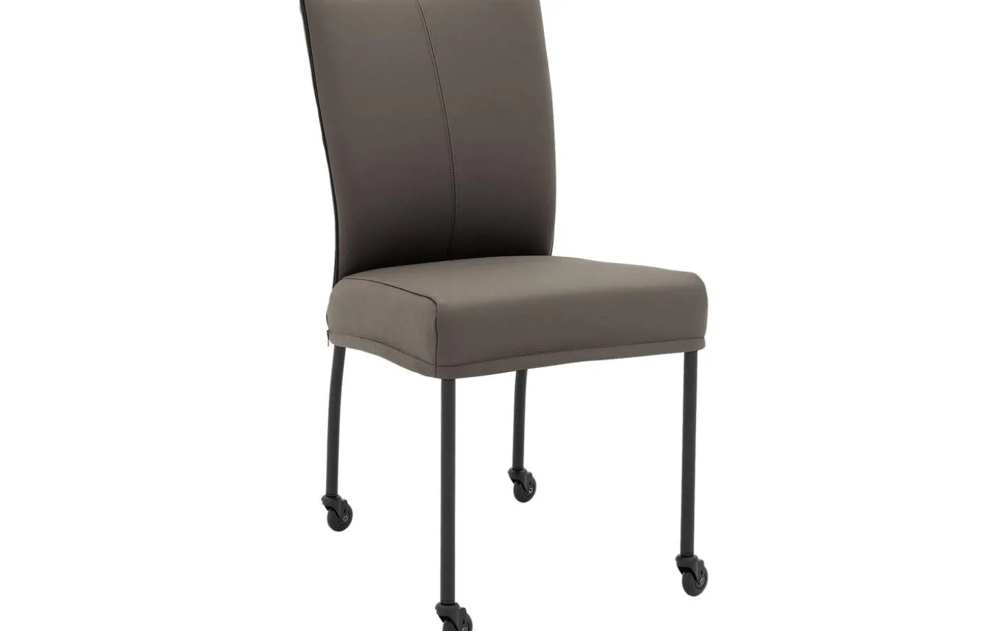 Mit seinen klaren Linien und dem langlebigen Masterleder hat dieser Stuhl eine moderne Ausstrahlung. Das mausgraue Leder ist durchgefärbt und verfügt über eine schützende Lackschicht, die es vor Sonnenlicht, Feuchtigkeit und Essensresten schützt. Das schwarze Gestell mit Pulverbeschichtung bietet ein solides und stilvolles Fundament, komplett mit praktischen Rollen.