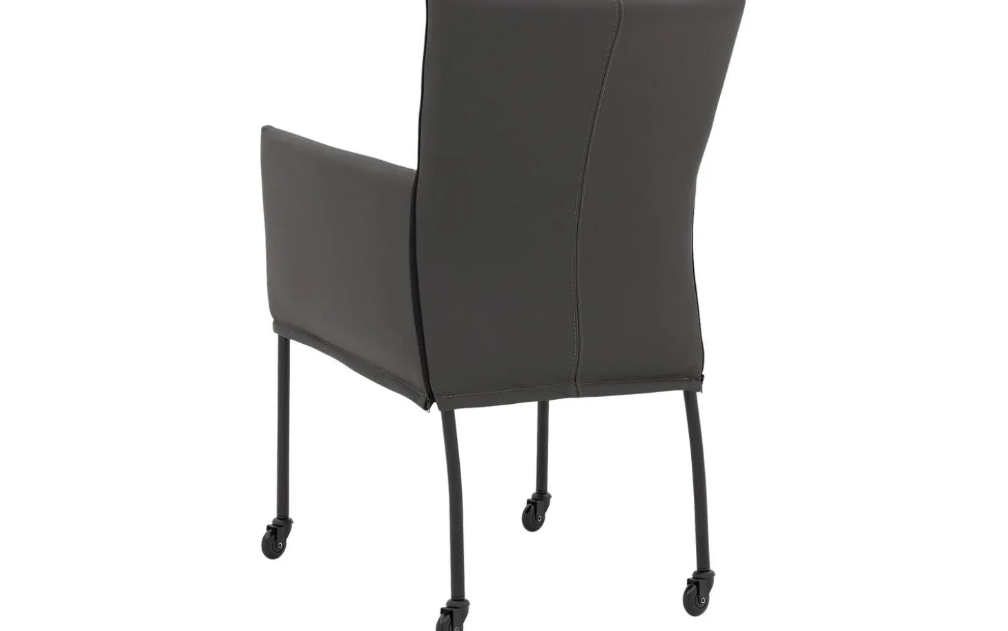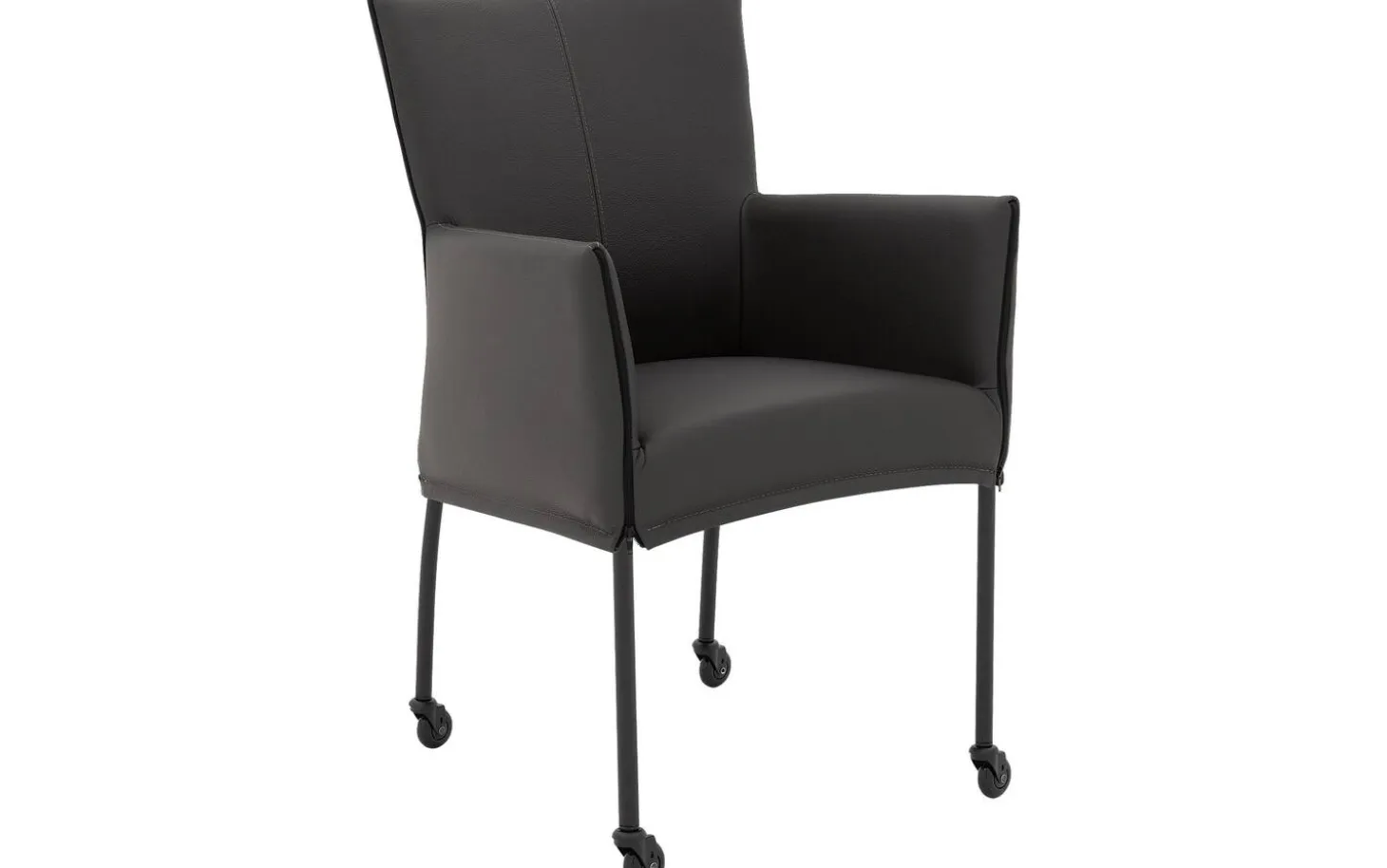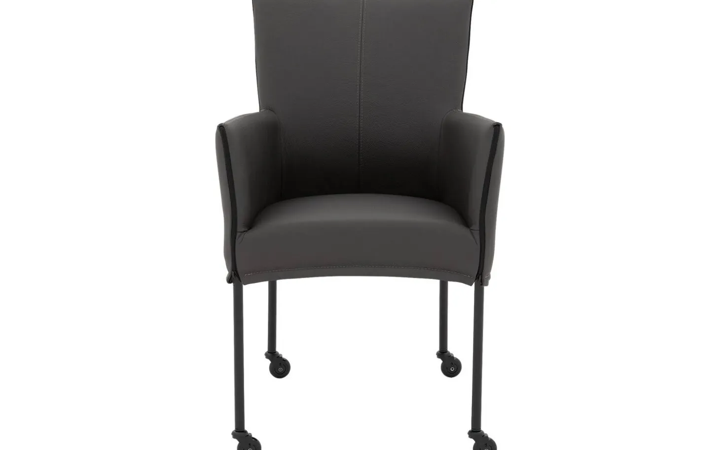 Grauer Esszimmerstuhl Funk mit Armlehne bietet stilvollen Komfort während langer Essen. Dieser Esszimmerstuhl aus Leder kombiniert modernes Design mit praktischer Benutzerfreundlichkeit. Das geschmeidige und langlebige dunkelgraue dicke Master-Leder verleiht dem Stuhl eine zeitlose Ausstrahlung, während die handwerkliche Polsterung für ein luxuriöses Gefühl sorgt. Dank der schwarzen Skate-Rollen schieben Sie sich leicht an den Esstisch heran.