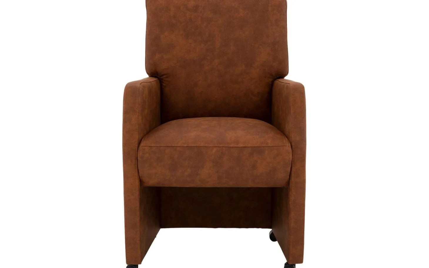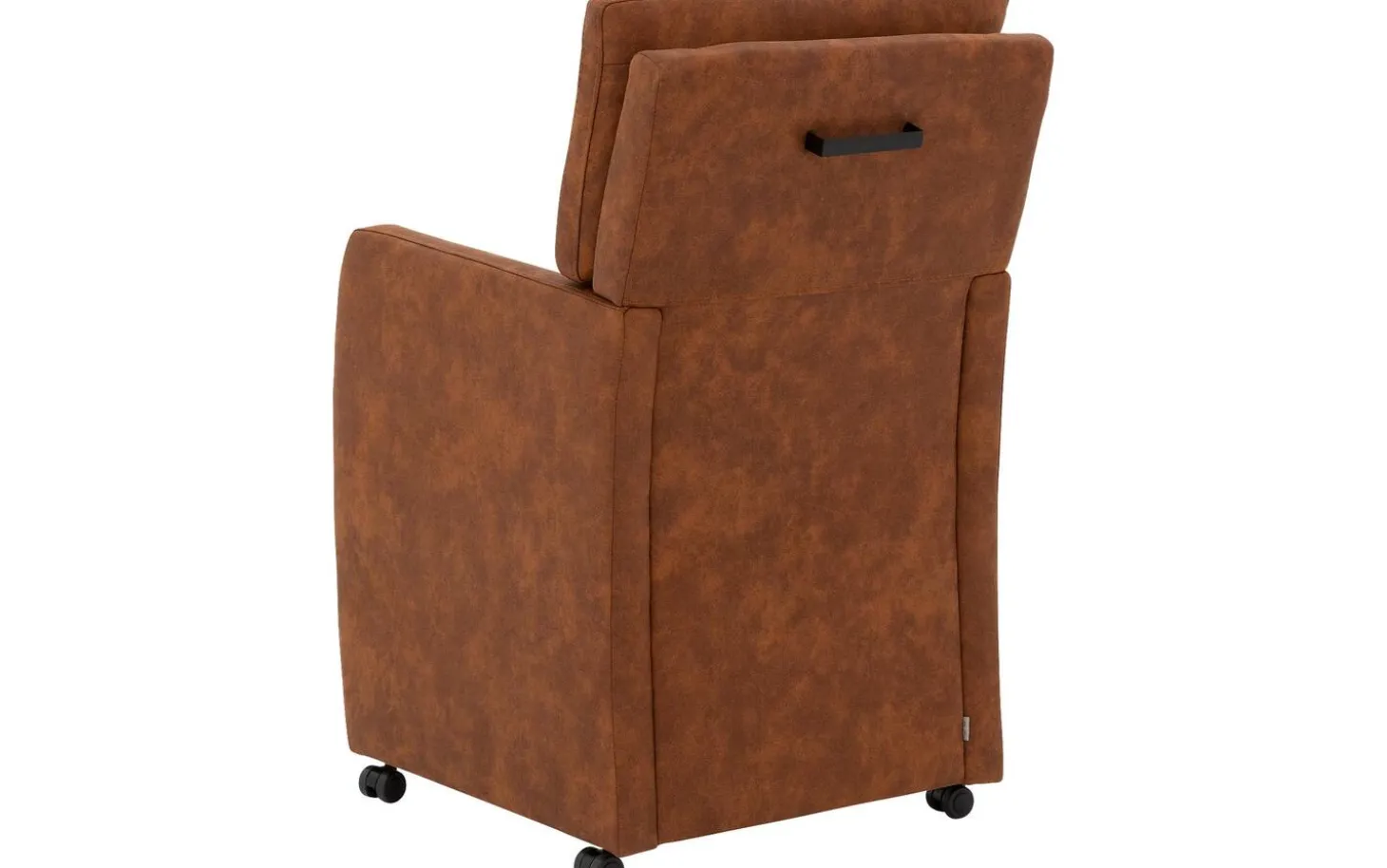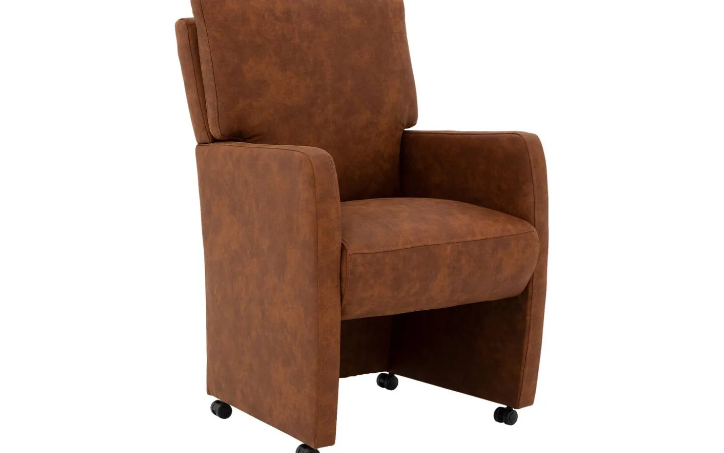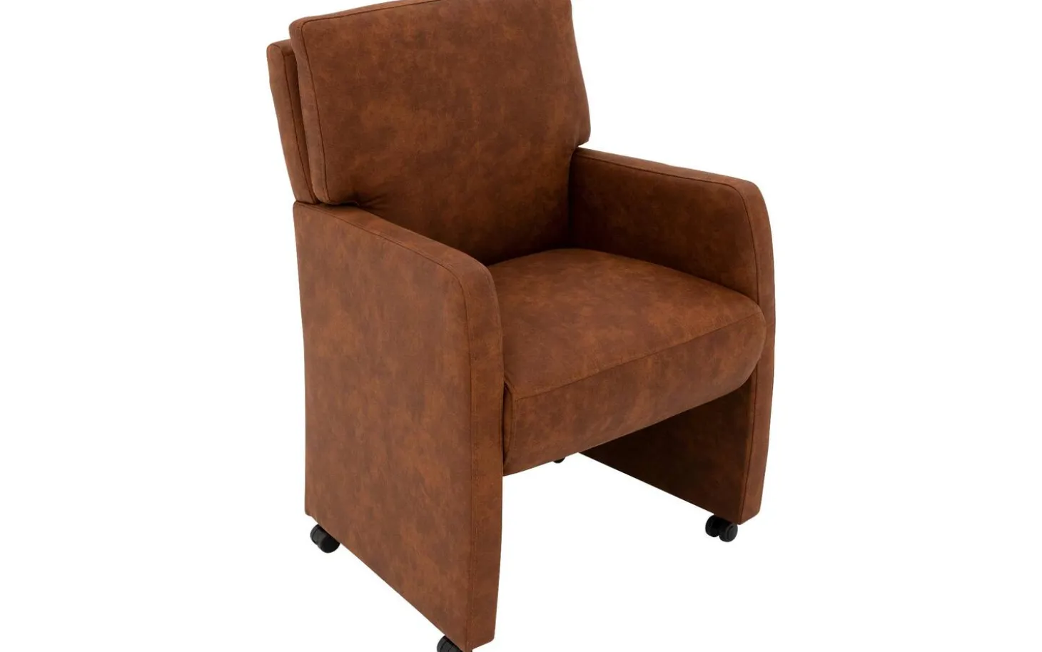 Entdecken Sie den Esszimmerstuhl Leen! Dieser cognacfarbene Esszimmerstuhl mit Armlehne ist mit einem warmen cognacfarbenen Mikrofaserstoff bezogen, der für eine gemütliche Atmosphäre in Ihrem Essbereich sorgt. Das moderne, zeitlose Design dieses Stuhls macht ihn zu einer vielseitigen Bereicherung für verschiedene Wohnstile. Dank der praktischen Rollen können Sie leicht an den Tisch heran- und wieder wegrollen, während der praktische Griff an der Rückenlehne das Verschieben noch einfacher macht.