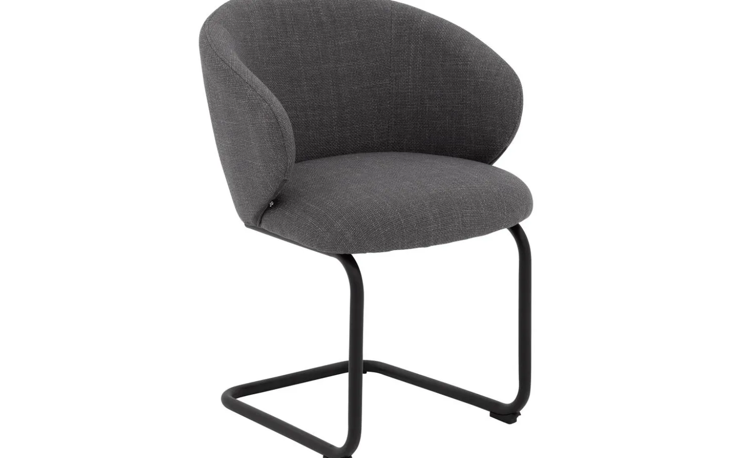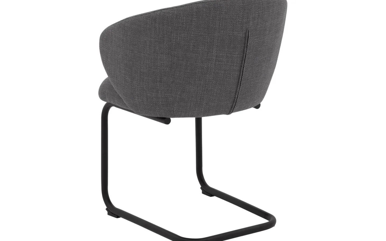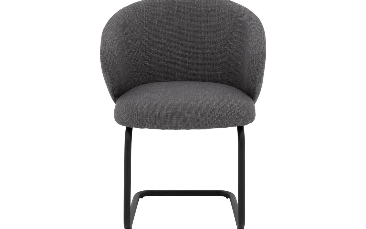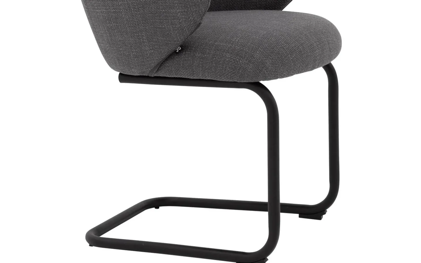 Grauer Esszimmerstuhl Noomi mit Armlehne bietet die perfekte Kombination aus Stil und Komfort für Ihren Essbereich. Die charakteristische runde Rückenlehne umschließt Ihren Körper während gemütlicher Mahlzeiten, während der grob gewebte dunkelgraue Stoff für eine zeitgemäße Ausstrahlung sorgt. Dieser Esszimmerstuhl mit schwarzem Freischwinggestell ist eine ideale Ergänzung für sowohl moderne als auch klassische Einrichtungen.