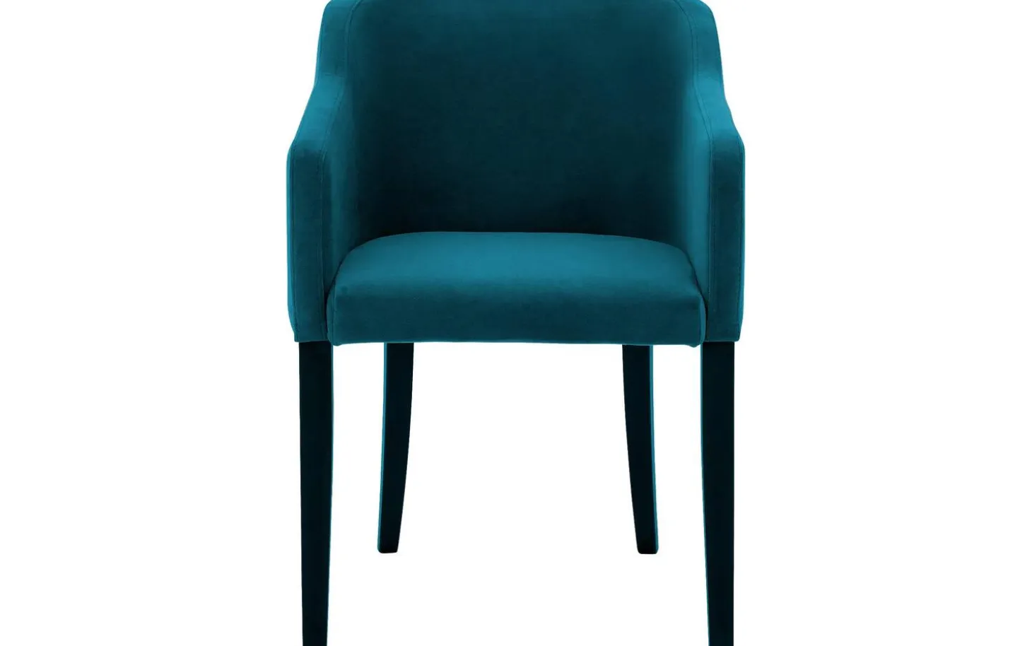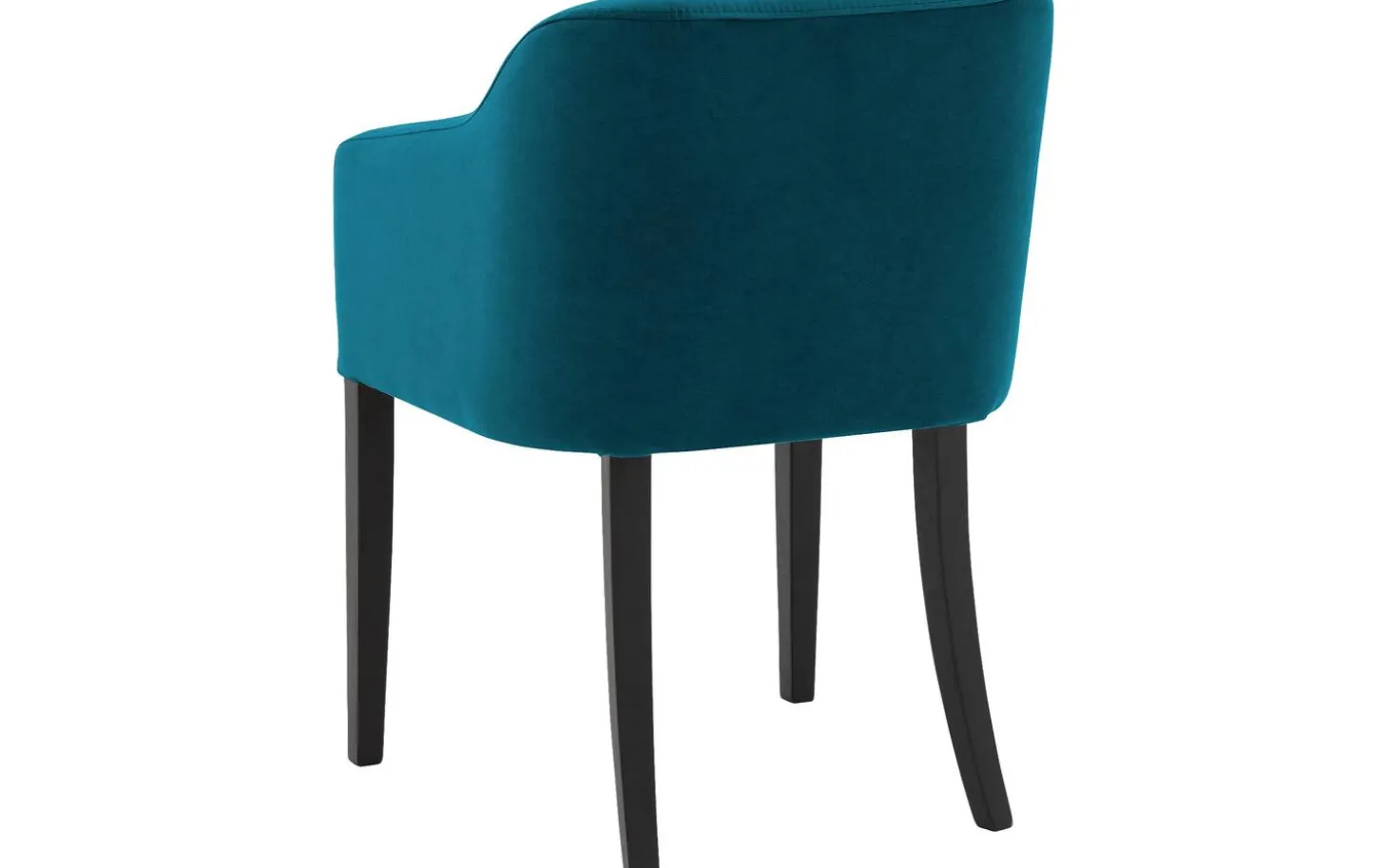 Die schlanken, konisch zulaufenden schwarzen Beine bilden einen schönen Kontrast zur reichhaltigen petrolblauen Velourspolsterung. Durch die elegante Silhouette und die feste Polsterung erhält dieser Stuhl eine klare, moderne Ausstrahlung, die zu verschiedenen Einrichtungsstilen passt.