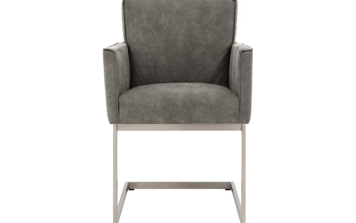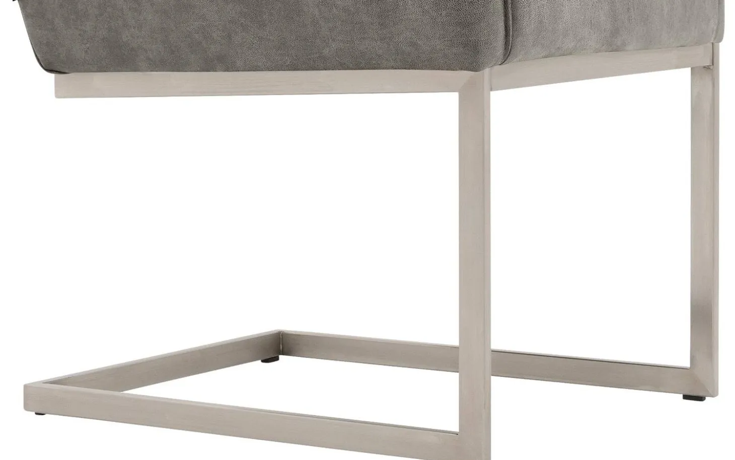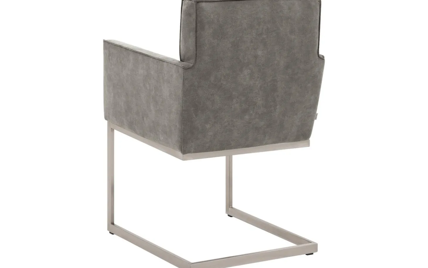Der graue Esszimmerstuhl Tom mit Armlehne ist ein robuster Begleiter für Ihren Esstisch. Das weiche Mikroleder in Hellgrau fühlt sich angenehm an und hat eine elegante Kappnaht, die den industriellen Charakter betont. Das Freischwinggestell aus Metall sorgt dafür, dass dieser Esszimmerstuhl leicht mit Ihren Bewegungen mitschwingt – ideal für lange Abendessen oder gemütliche Zusammenkünfte. Dieser Esszimmerstuhl passt perfekt in ein robustes urbanes Interieur und lässt sich hervorragend mit der Esszimmerbank Tom für eine komplette Essecke mit Charakter kombinieren.