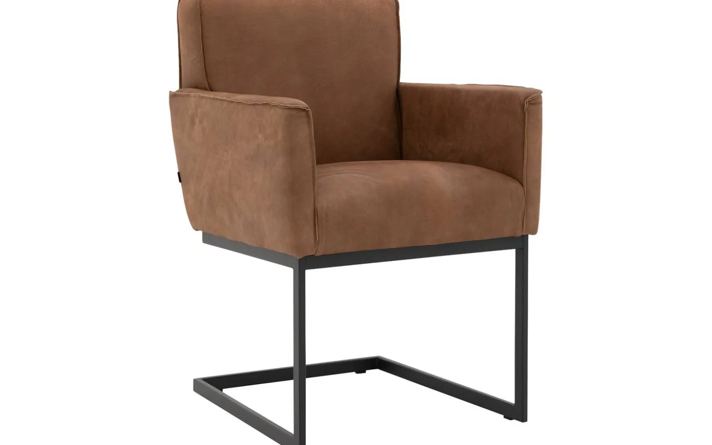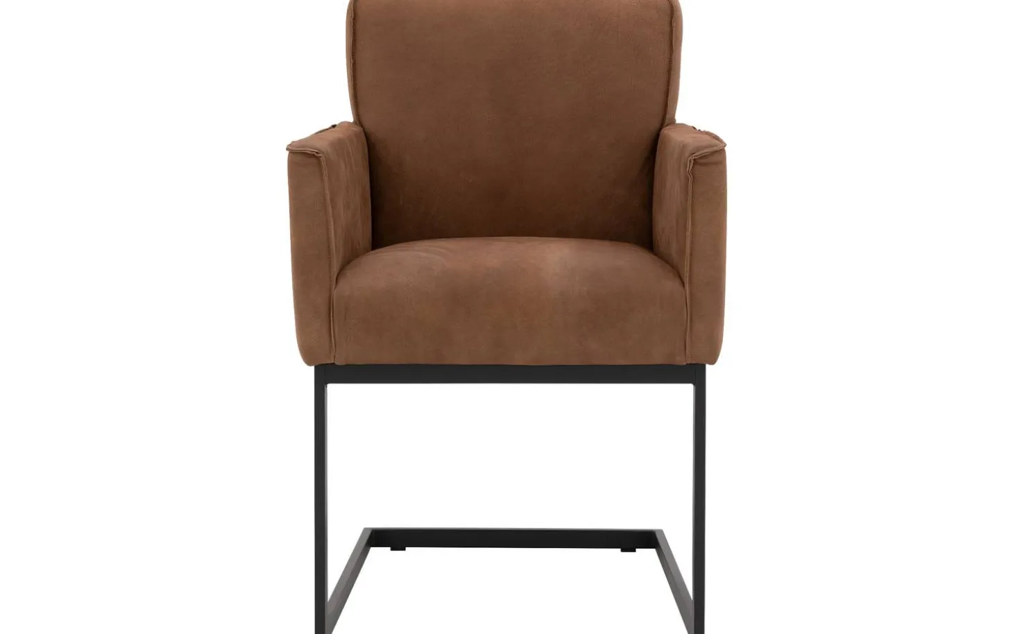 Brauner Esszimmerstuhl Tom aus Leder mit Armlehne bringt industrielle Robustheit in Ihren Essbereich. Dieser Stuhl aus der Goossens Wohnen Excellent Kollektion zeichnet sich durch das weiche Büffelleder mit wildlederähnlicher Ausstrahlung und eleganter Ziernaht aus. Das schwarze Freischwinggestell sorgt dafür, dass der Stuhl beim Essen leicht mitschwingt – ideal für lange Mahlzeiten und gemütliche Abende mit Freunden und Familie. Kombinieren Sie diesen Esszimmerstuhl perfekt mit der passenden Esszimmerbank Tom für einen kompletten Essbereich mit robustem Charakter.
