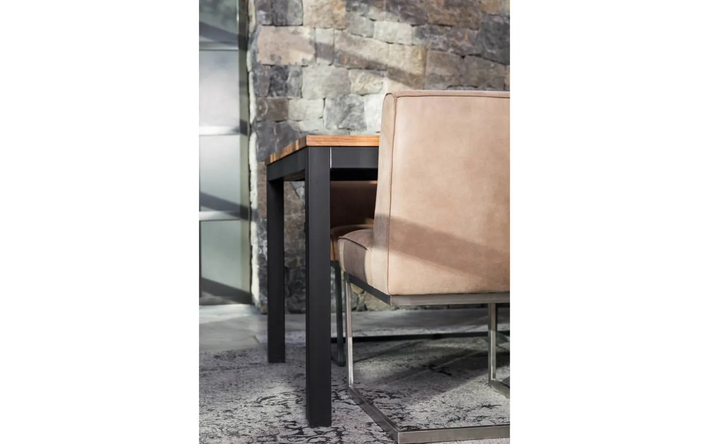 Tom lässt sich perfekt mit der Esszimmerbank aus derselben Serie kombinieren, für einen kompletten urban-industriellen Look. Die feste Polsterung sorgt für eine klare und moderne Ausstrahlung, die jahrelang schön bleibt. Mit einer Sitzbreite von 53 cm und einer Sitztiefe von 44 cm bietet der Stuhl ausreichend Platz für komfortables Dinieren.