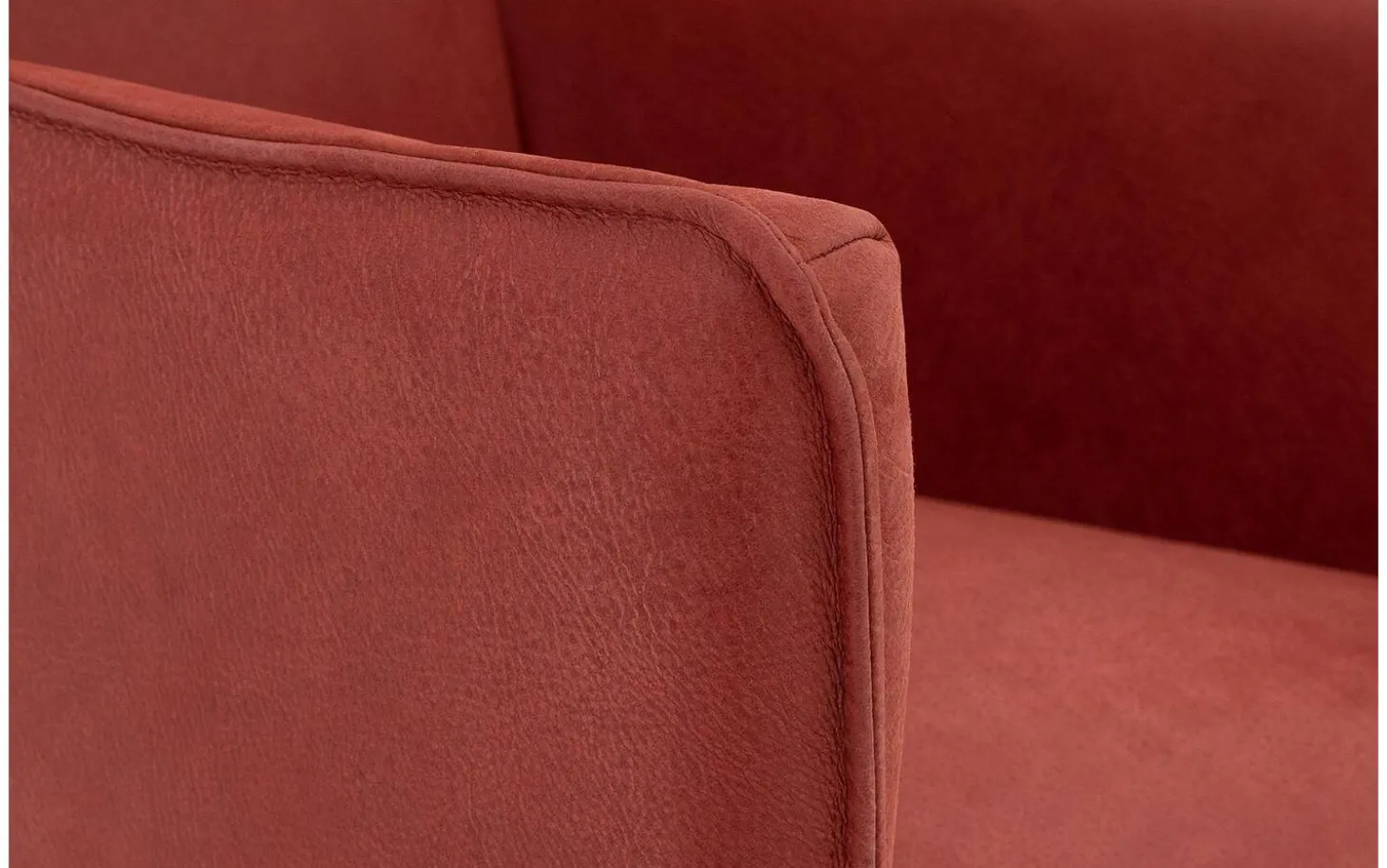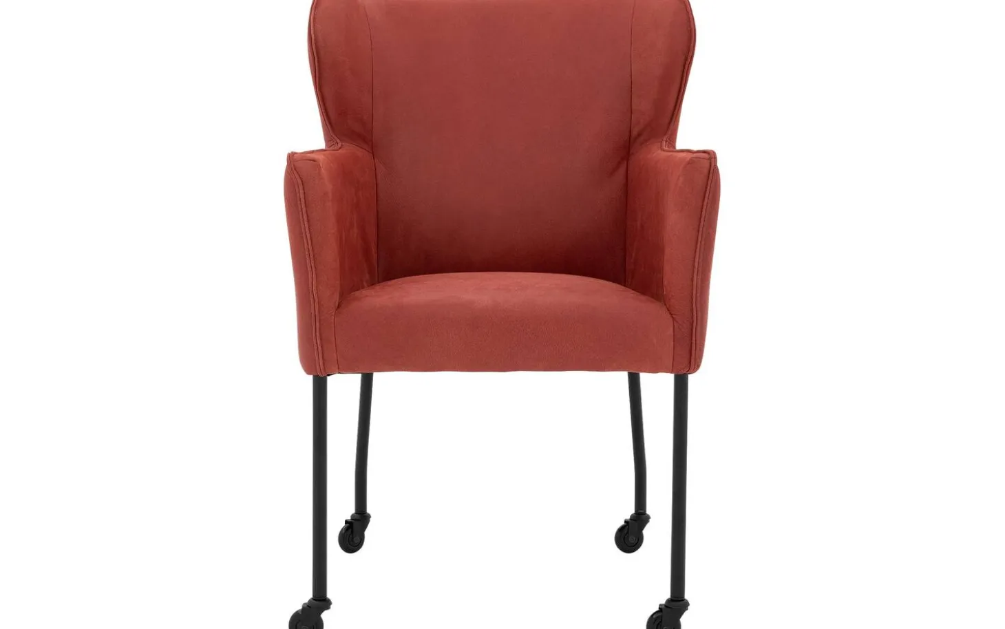 Esszimmerstuhl Leogang mit Armlehne in rotem Leder bringt einen eleganten Akzent an Ihren Esstisch. Dieser schlanke Stuhl erinnert an einen klassischen Ohrensessel, jedoch in einer modernen Version für den Esstisch. Das rote Buffalo-Leder verleiht eine luxuriöse, wildlederähnliche Ausstrahlung, während das schlanke Untergestell für einen luftigen Look sorgt. Mit den praktischen schwarzen Rollen können Sie leicht an den Tisch heran- und wieder wegfahren.