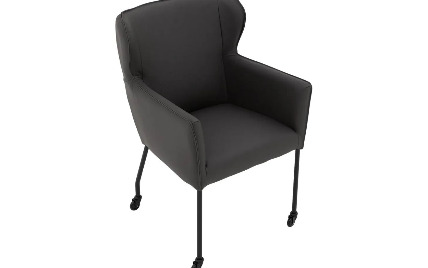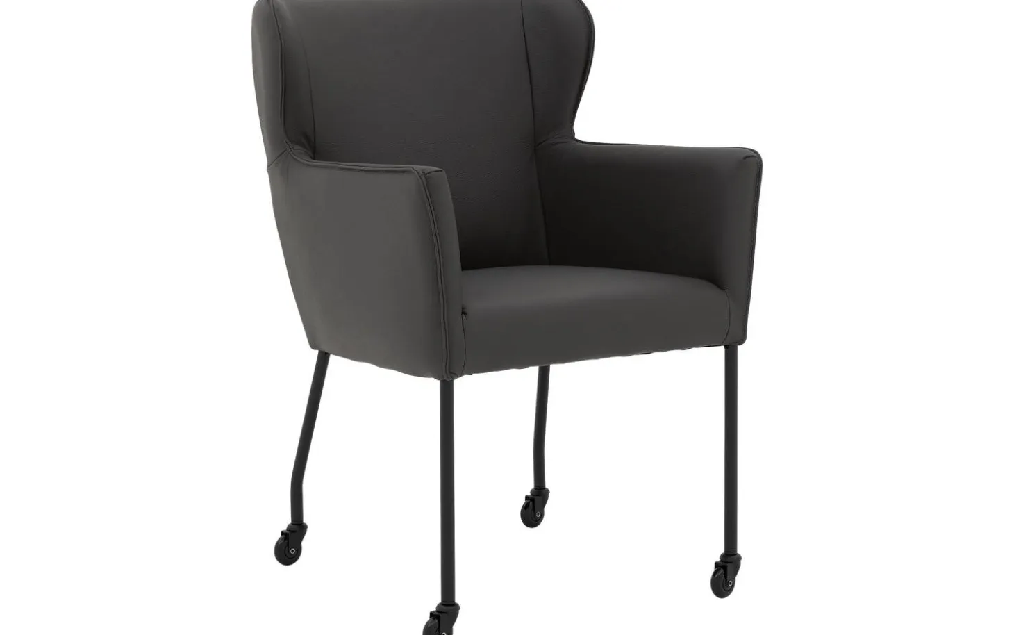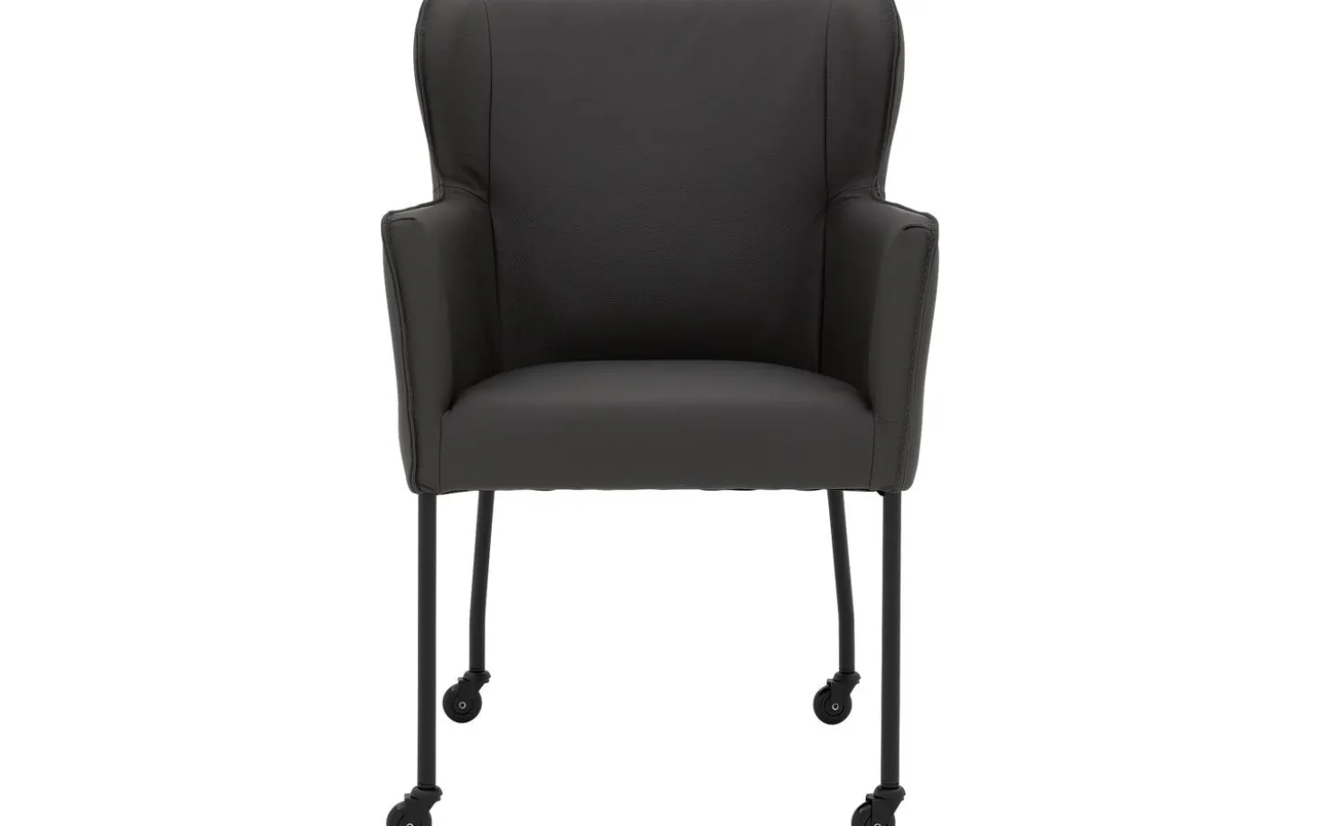 Grauer Esszimmerstuhl Leogang mit Armlehne kombiniert stilvolles Design mit praktischer Funktionalität. Dieser schlanke Stuhl erinnert an einen klassischen Ohrensessel, jedoch übersetzt in einen modernen Esszimmerstuhl. Das dunkelgraue dicke Master-Leder verleiht Leogang eine luxuriöse Ausstrahlung, während das schlanke schwarze Gestell mit Rollen für einen luftigen Look sorgt. Setzen Sie sich leicht an den Tisch und genießen Sie lange Essen an Ihrem Esstisch.