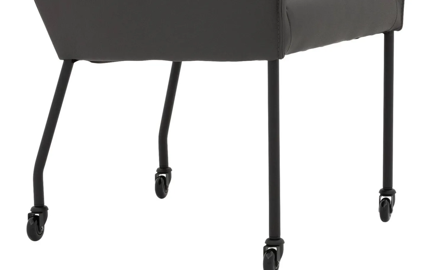 Mit einer Sitzbreite von 45 cm und einer Rückenlehnenhöhe von 43 cm bietet der Stuhl angenehme Maße. Die feste Polsterung sorgt für einen straffen, modernen Look, der jahrelang schön in Ihrem Esszimmer bleibt. Die schwarzen Rollen machen diesen Stuhl besonders praktisch im Gebrauch.