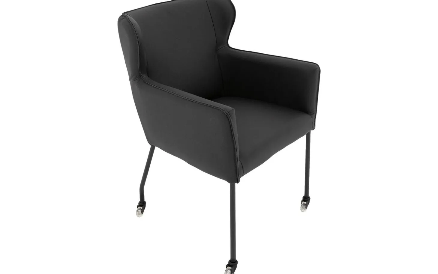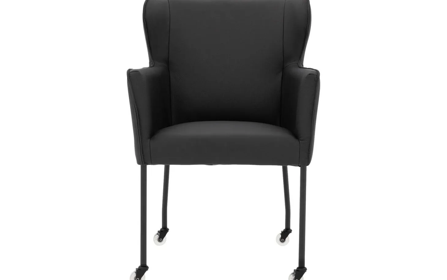 Der schwarze Rahmen mit Pulverbeschichtung passt perfekt zur schwarzen Lederpolsterung. Die feste Polsterung verleiht diesem Stuhl ein klares, modernes Erscheinungsbild. Die Sitzbreite von 45 cm und eine Sitztiefe von 45 cm sorgen für eine komfortable Sitzposition, während die praktischen Rollen das Heranrücken an den Tisch erleichtern.