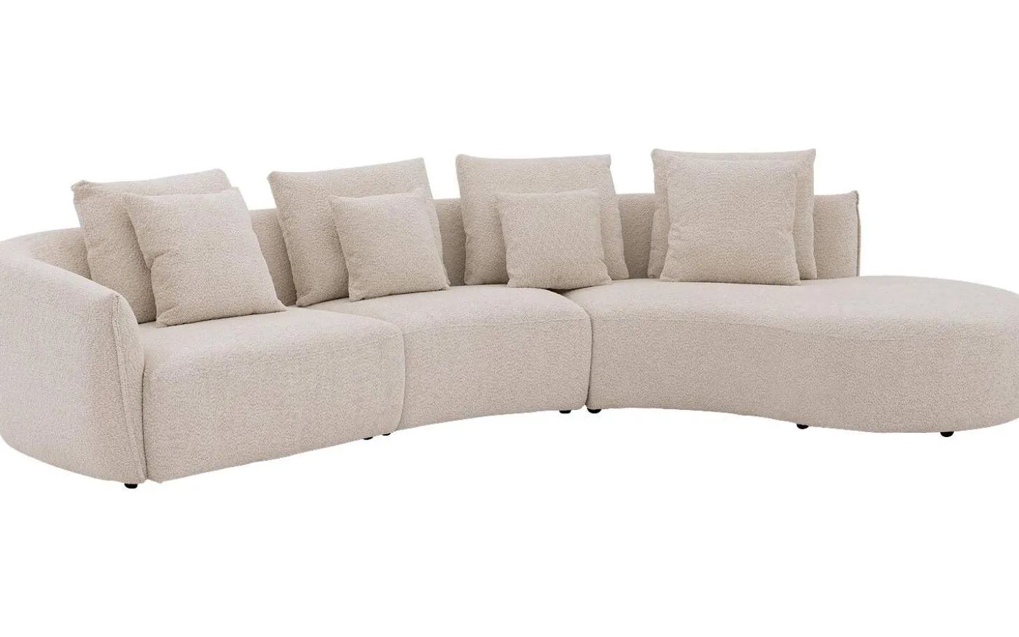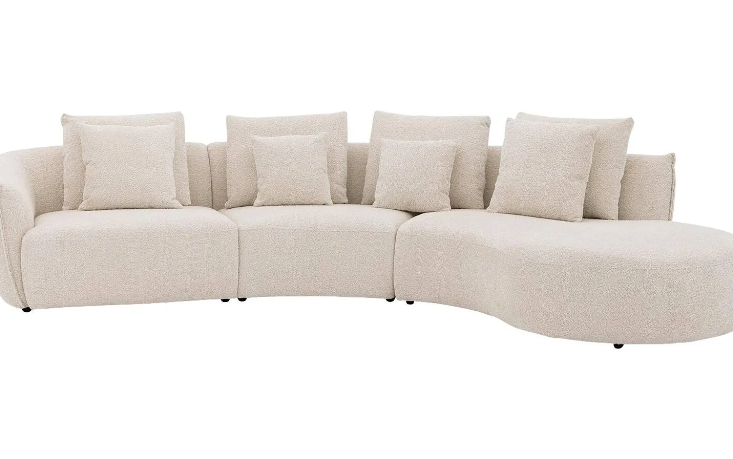 Heerlijk ontspannen met hoekbank Fay! Deze witte hoekbank van zachte bouclé stof is niet alleen een trendy toevoeging aan je interieur, maar ook een bron van ultiem zit- en ligcomfort. Met zijn kenmerkende ronde vormgeving brengt Fay een speelse en moderne sfeer in je woonkamer. Deze hoekbank met chaise longue rechts biedt genoeg ruimte om lekker te loungen. Compleet met vier rugkussens en vier sierkussens, zorgt Fay voor die extra gezelligheid.