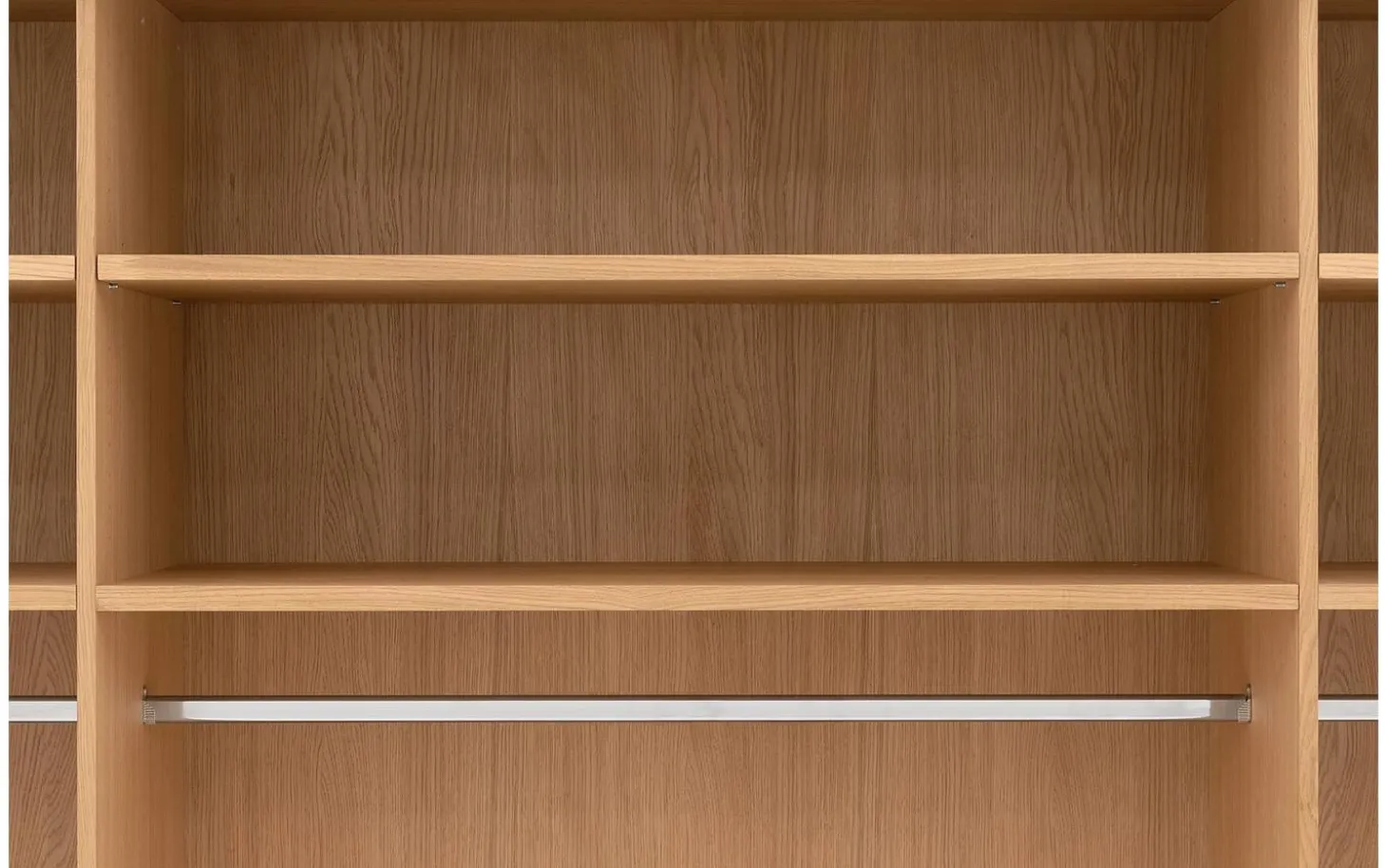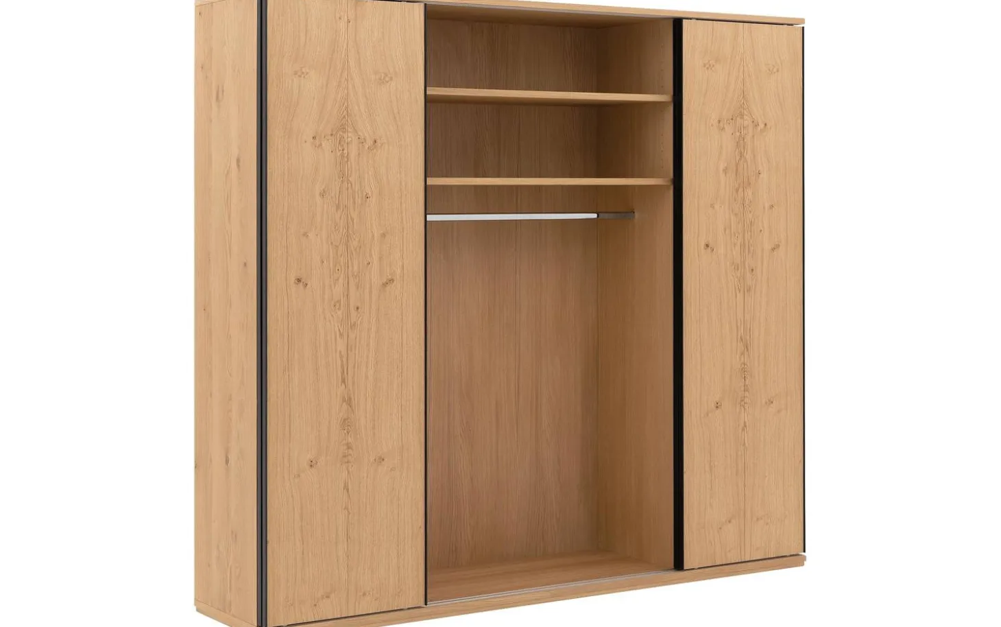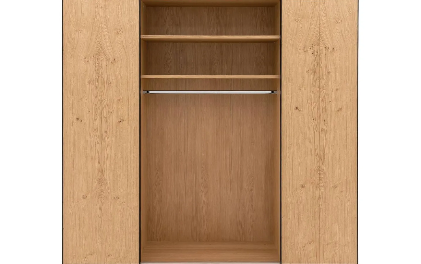 De ombouw van kledingkast Wood is van massief eiken panelen. De deuren zijn voorzien van eiken fineer.