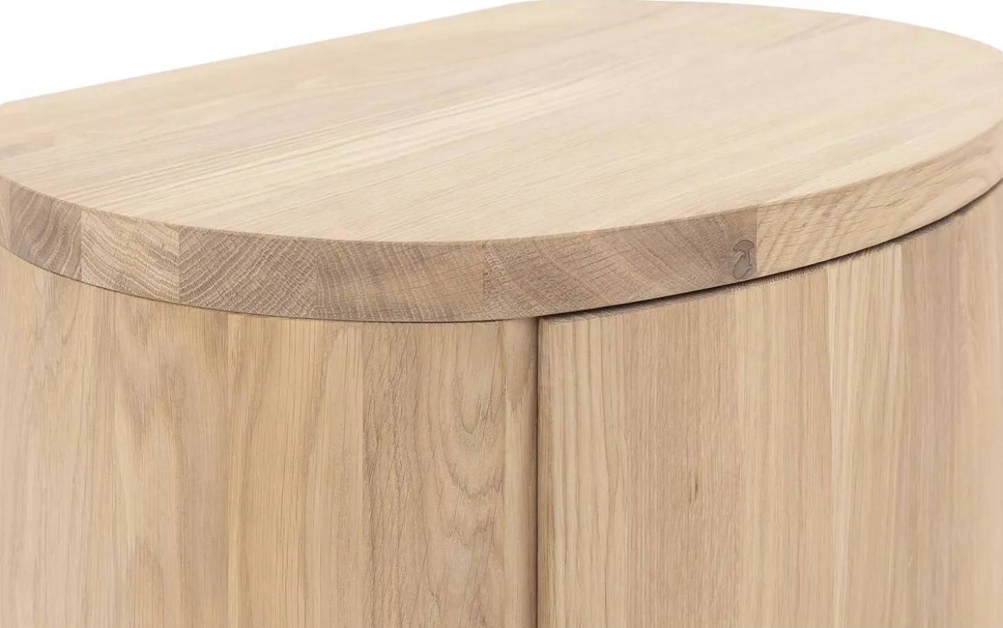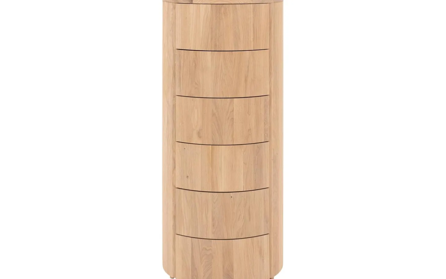 Der Schubladenschrank Denzo verleiht Ihrem Schlafzimmer das gewisse Extra. Denzo besticht durch sein ungewöhnliches Design: Die Kombination aus geradlinigen und runden Formen schafft ein wahres Unikat. Das moderne Modell ist aus massivem Eichenholz gefertigt und besticht durch sein warmes, natürliches Flair, das sich in jedes Schlafzimmer integrieren lässt. Dank des Eichenholzes hat diese Kommode zudem eine lange Lebensdauer. Gleich sechs Schubladen bieten reichlich Stauraum für Ihre persönlichen Gegenstände. Die Kommode ist mit einem passenden Nachtschränkchen und Bett aus der Denzo-Kollektion kombinierbar.