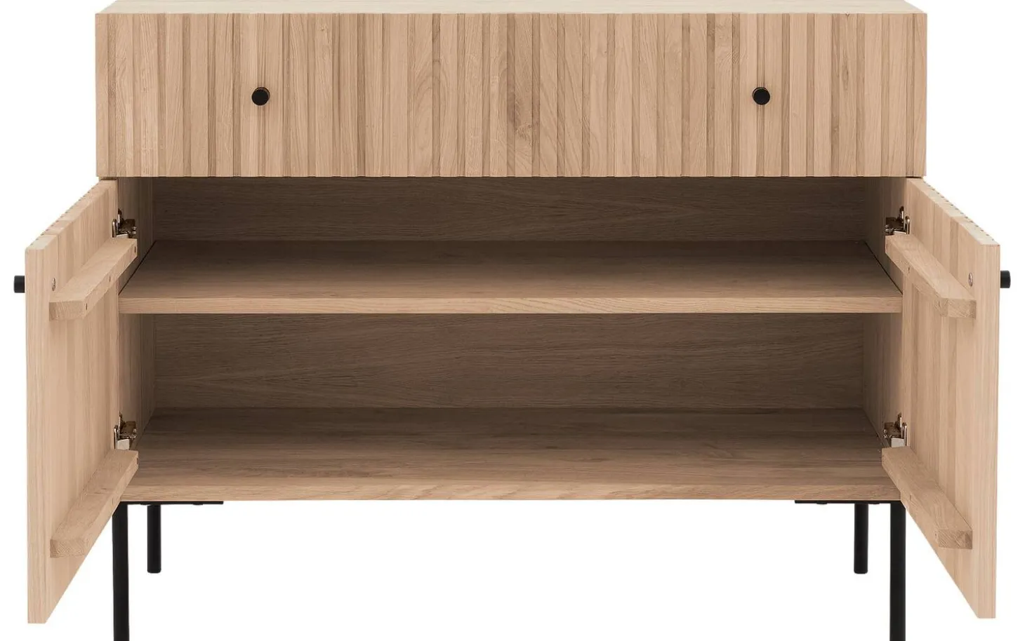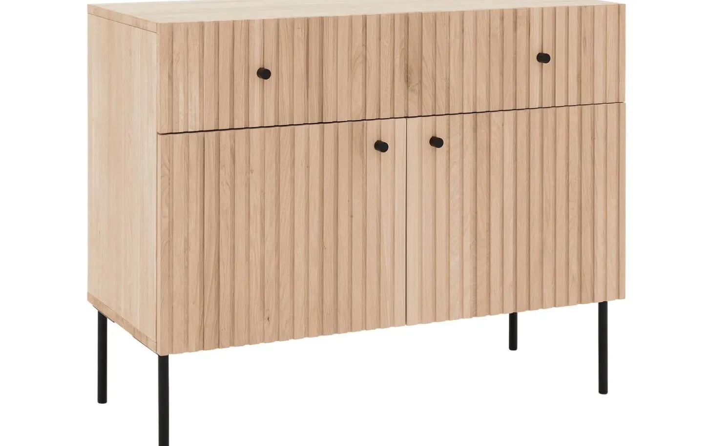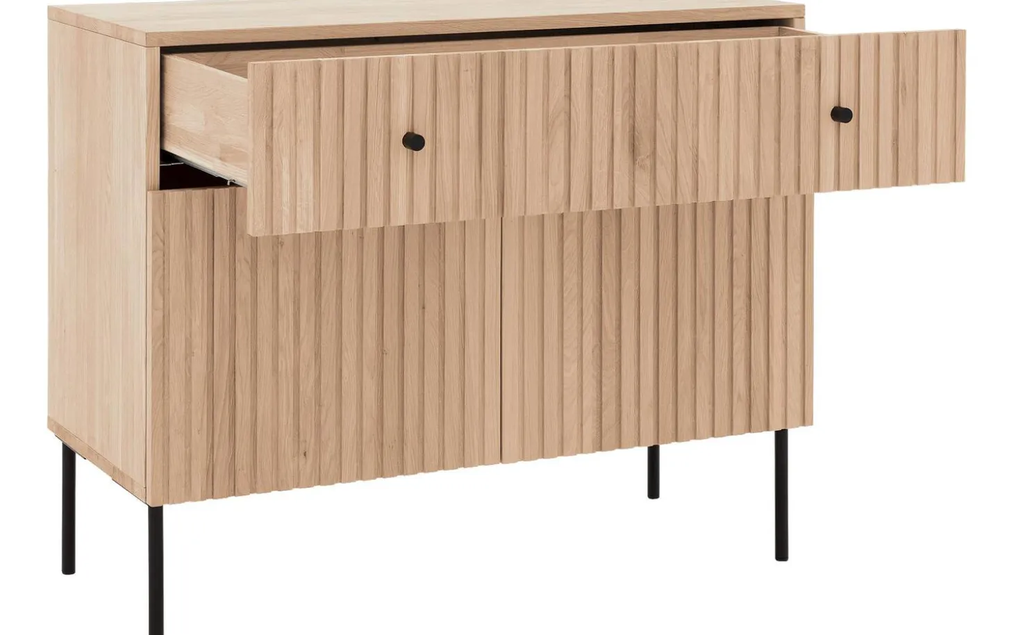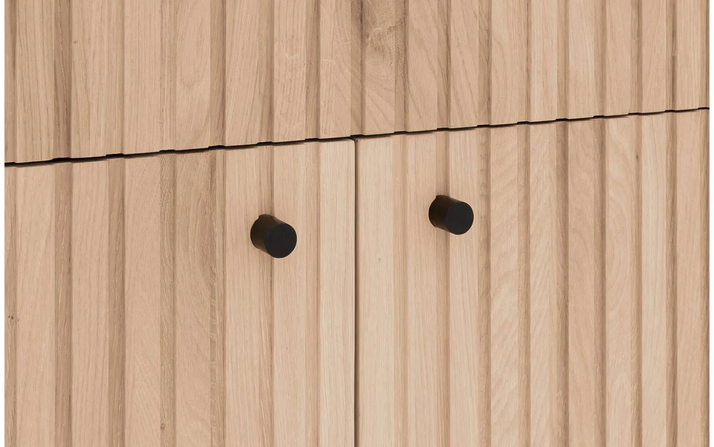 Sie suchen eine Kommode für Ihr Schlafzimmer? Wie wäre es mit der Kommode Capelli? Die vertikalen Linien verleihen der Kommode eine außergewöhnliche Optik. Die Kommode Capelli besticht durch ihr modernes Design, das sich aus der Kombination aus Eichenholz mit schwarzen runden Metallfüßen und passenden Griffen ergibt. Die hohen Füße verleihen der Kommode eine räumliche Optik und erleichtern zudem das Staubsaugen unter der Kommode.
