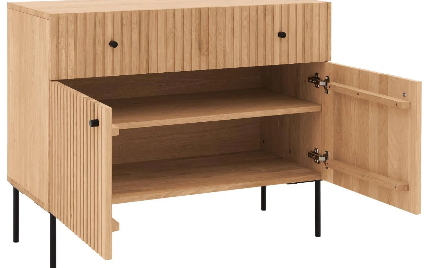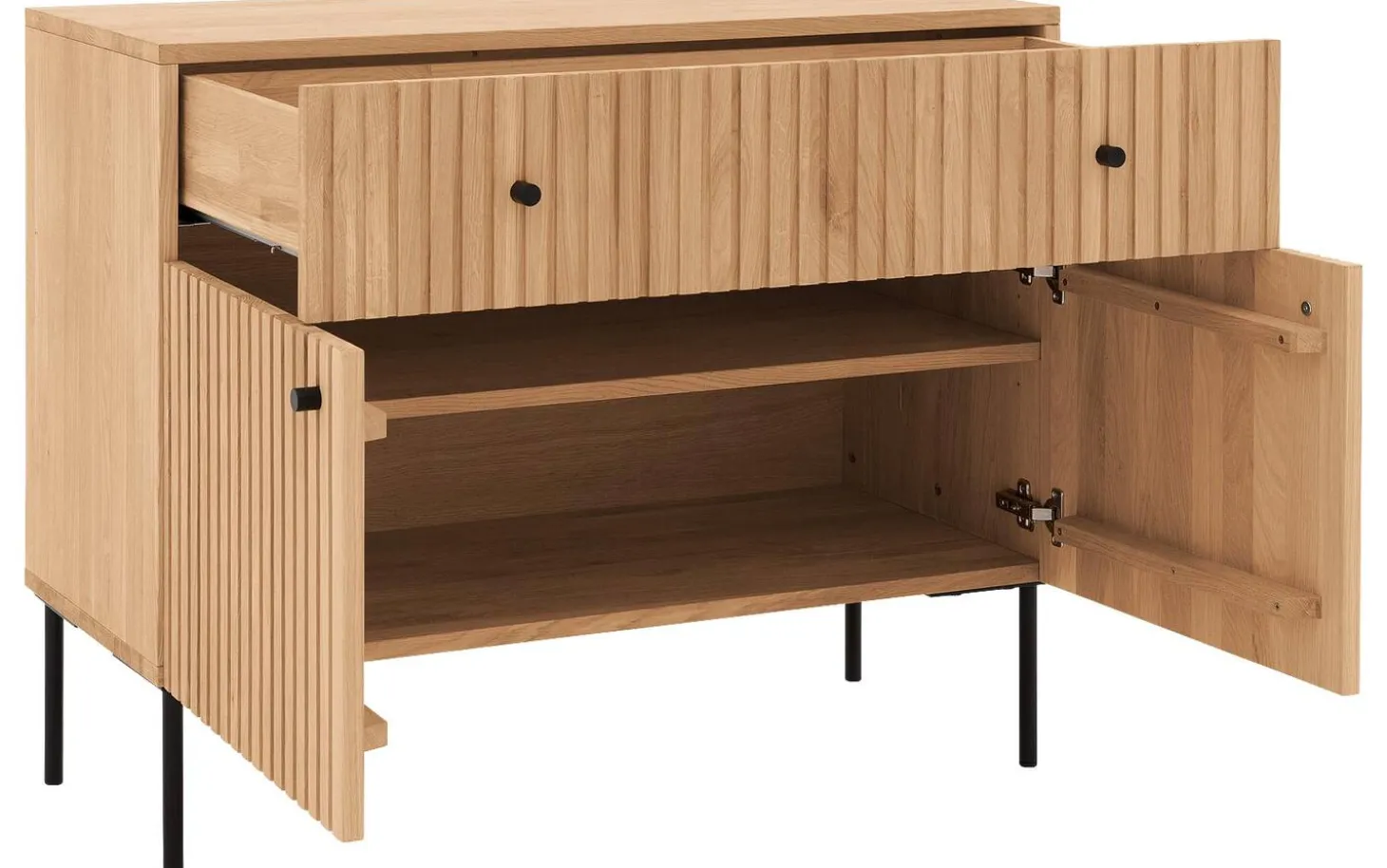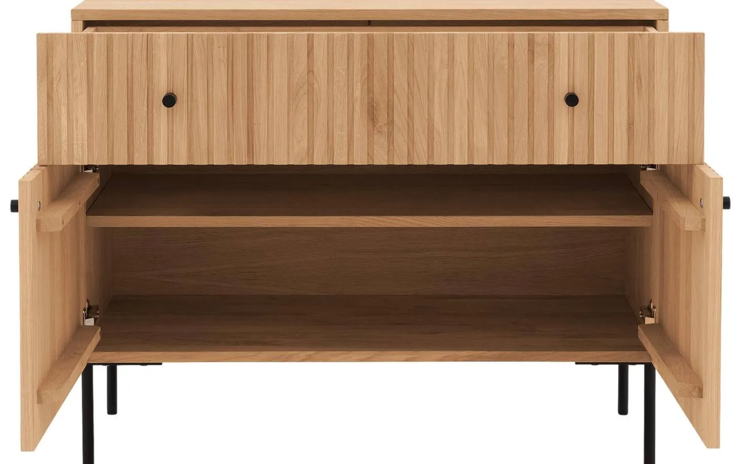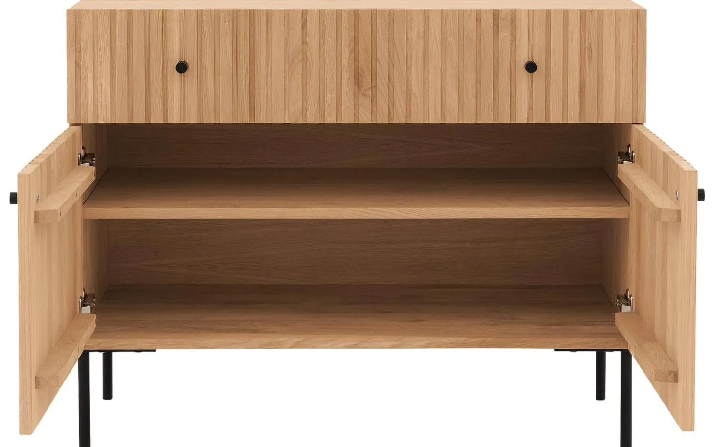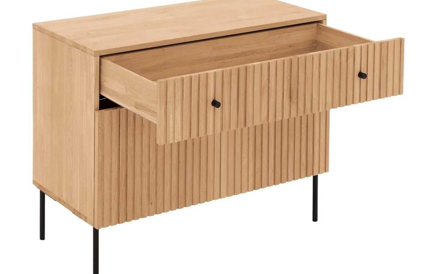Sie suchen eine Kommode für Ihr Schlafzimmer? Wie wäre es mit der Kommode Capelli? Die vertikalen Linien verleihen der Kommode eine außergewöhnliche Optik. Die Kommode Capelli besticht durch ihr modernes Design, das sich aus der Kombination aus Eichenholz mit schwarzen runden Metallfüßen und passenden Griffen ergibt. Die hohen Füße verleihen der Kommode eine räumliche Optik und erleichtern zudem das Staubsaugen unter der Kommode.