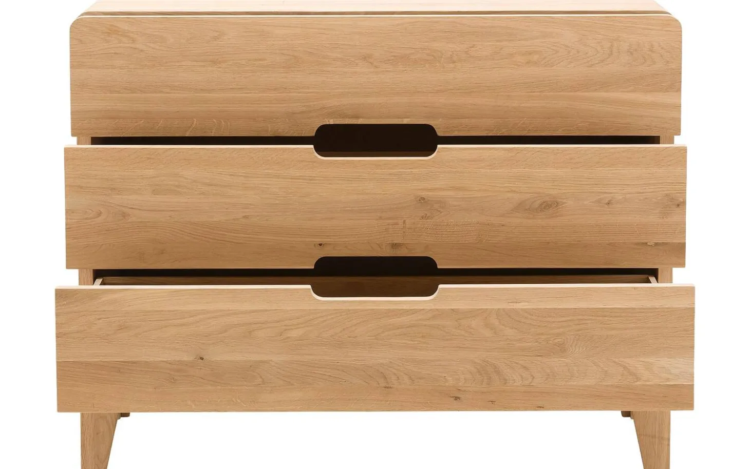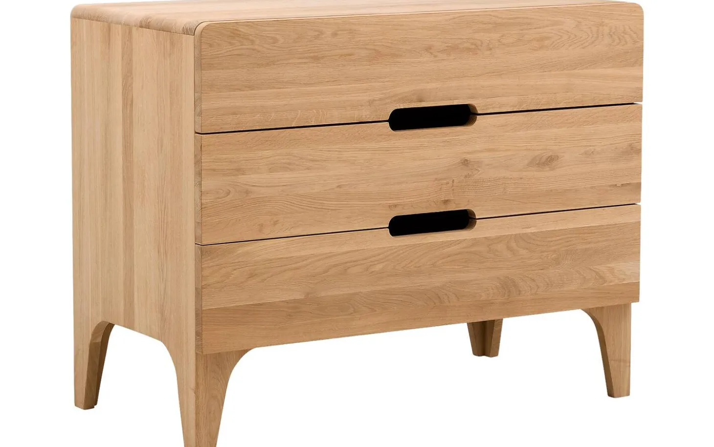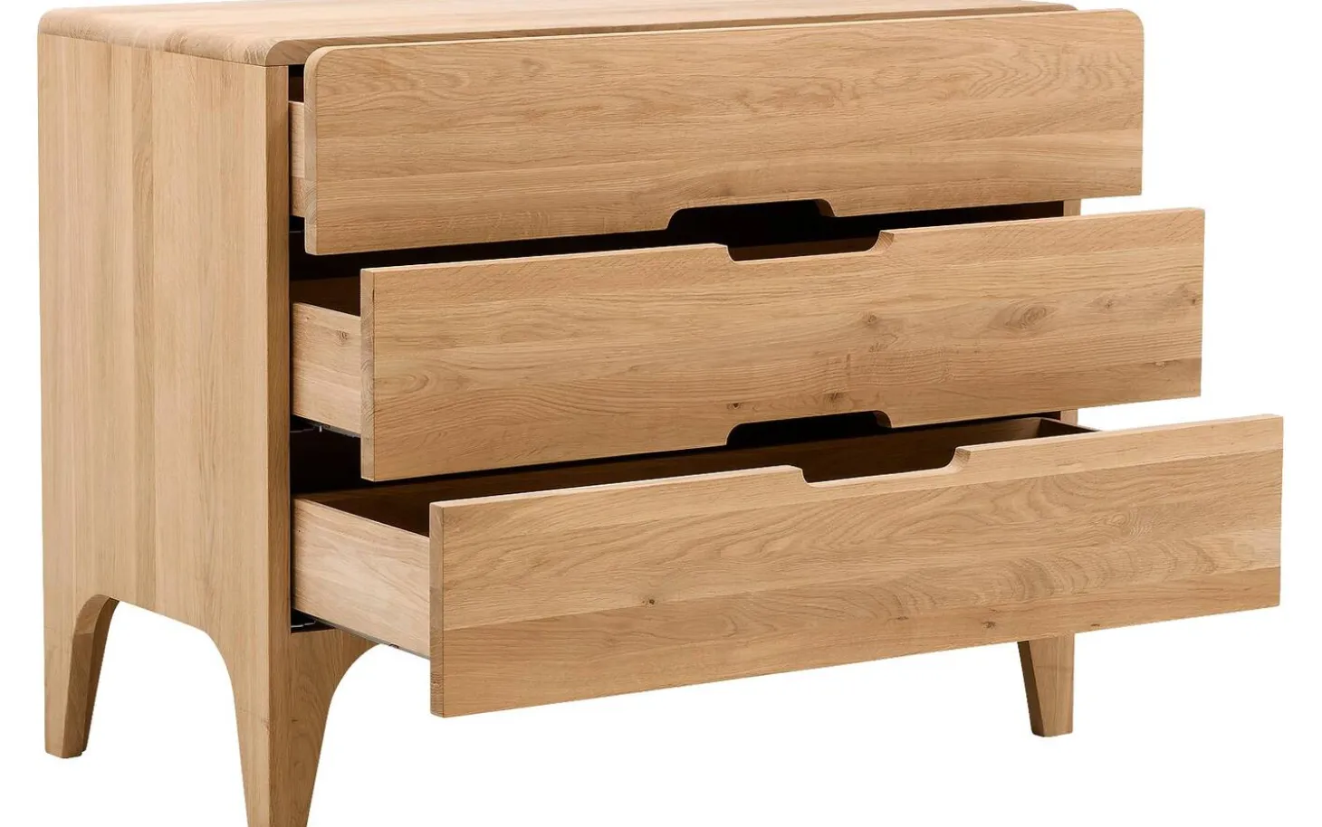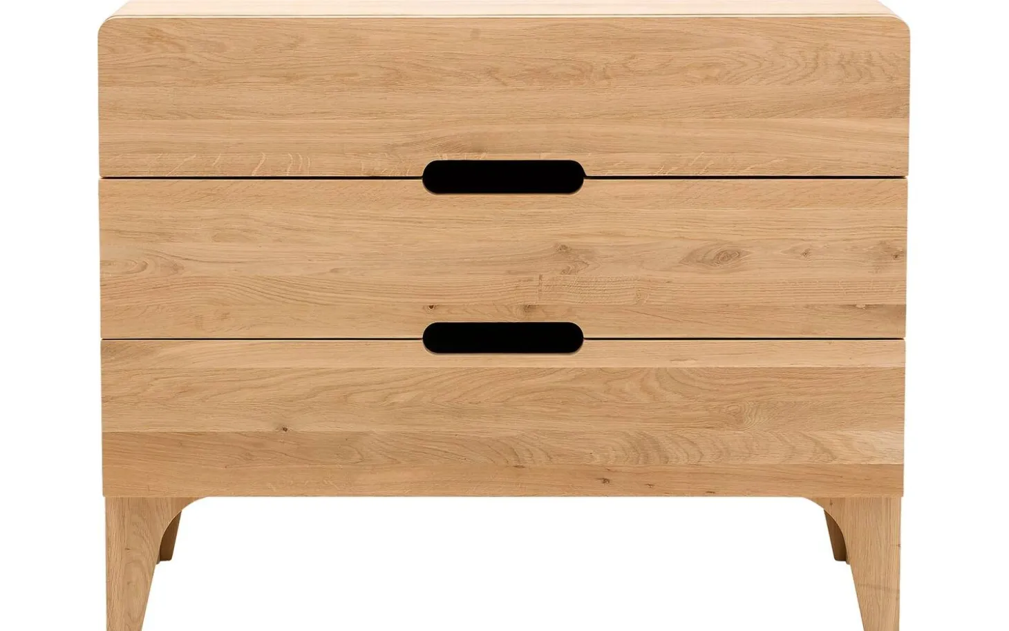 Curve ist eine Kommode mit unverwechselbarem Charakter. Die Kommode mit 3 Schubladen wird mit größter Sorgfalt aus langlebigem Eichenholz gefertigt. Die einzigartigen runden Formen sind ein Beweis großartigen fachmännischen Könnens. Die Schubladen des Schränkchens sind außerdem mit einem Soft-Closing-System ausgestattet. Dieses System gewährleistet ein leichtes und geräuschloses Schließen der Schubladen. Schaffen Sie jetzt die perfekte gemütliche Atmosphäre in Ihrem Schlafzimmer und kombinieren Sie die Kommode Curve mit anderen Möbelstücken aus der Serie Curve.