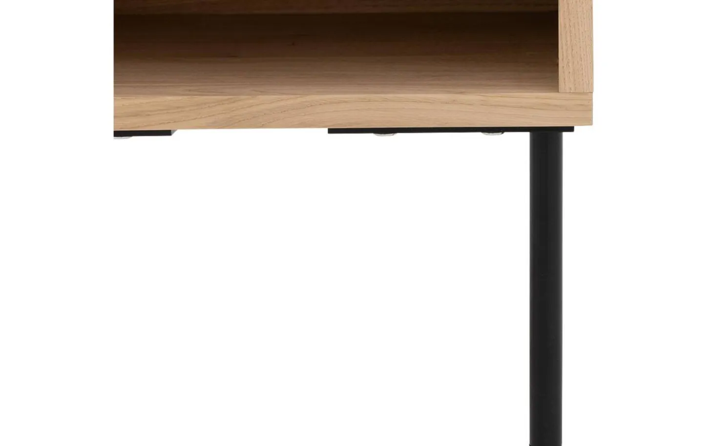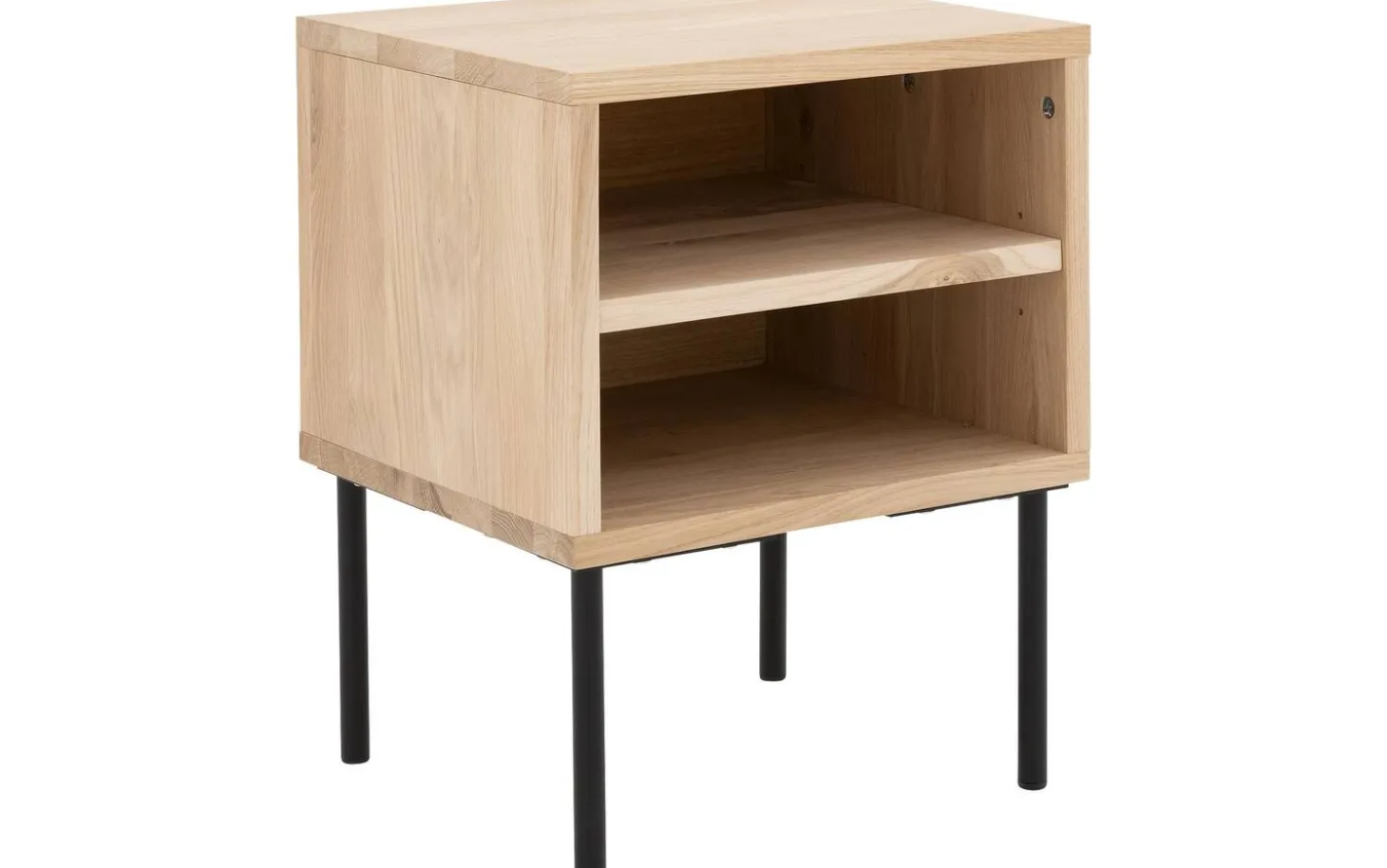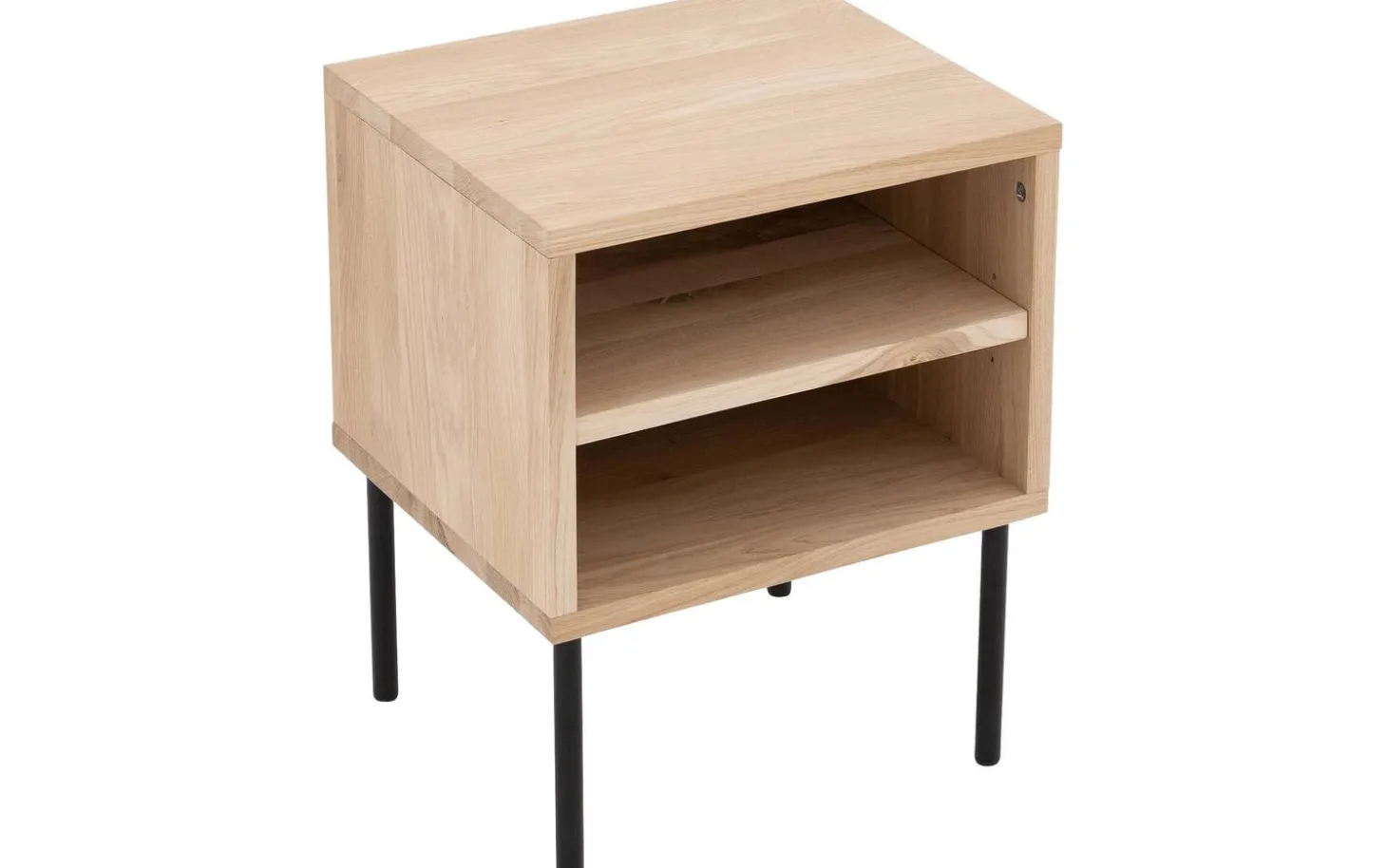 Nachtkastje Capelli heeft een modern en bijzonder design. De twee open vakken zorgen ervoor dat jij je spulletjes gemakkelijk kan opbergen en het eikenhout in combinatie met de zwarte metalen ronde poten geven een stoere, maar toch natuurlijke uitstraling. De hoge poten geven een ruimtelijke look en maken het schoonmaken onder het nachtkastje gemakkelijk.