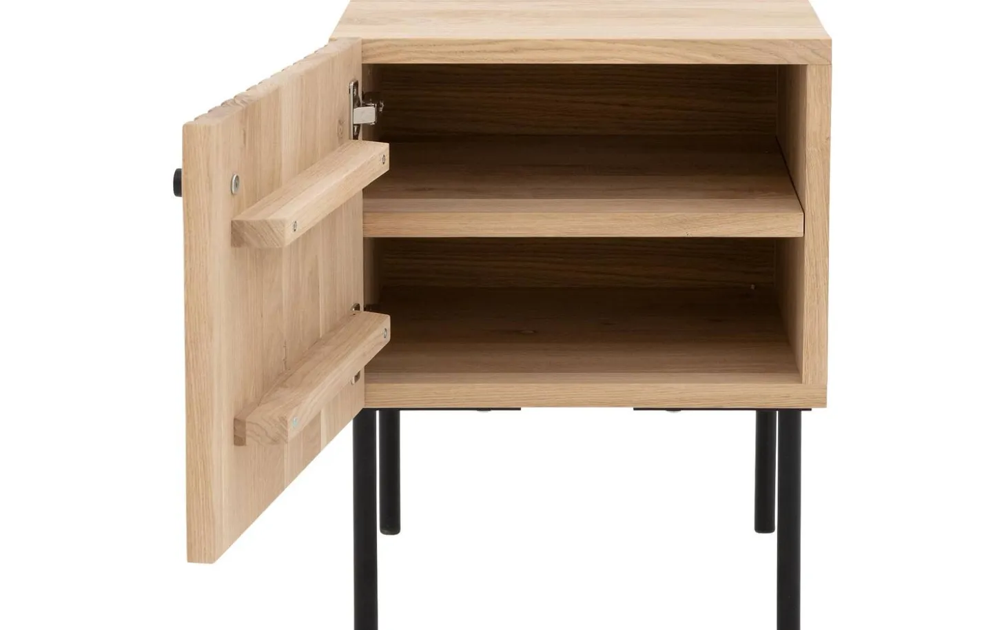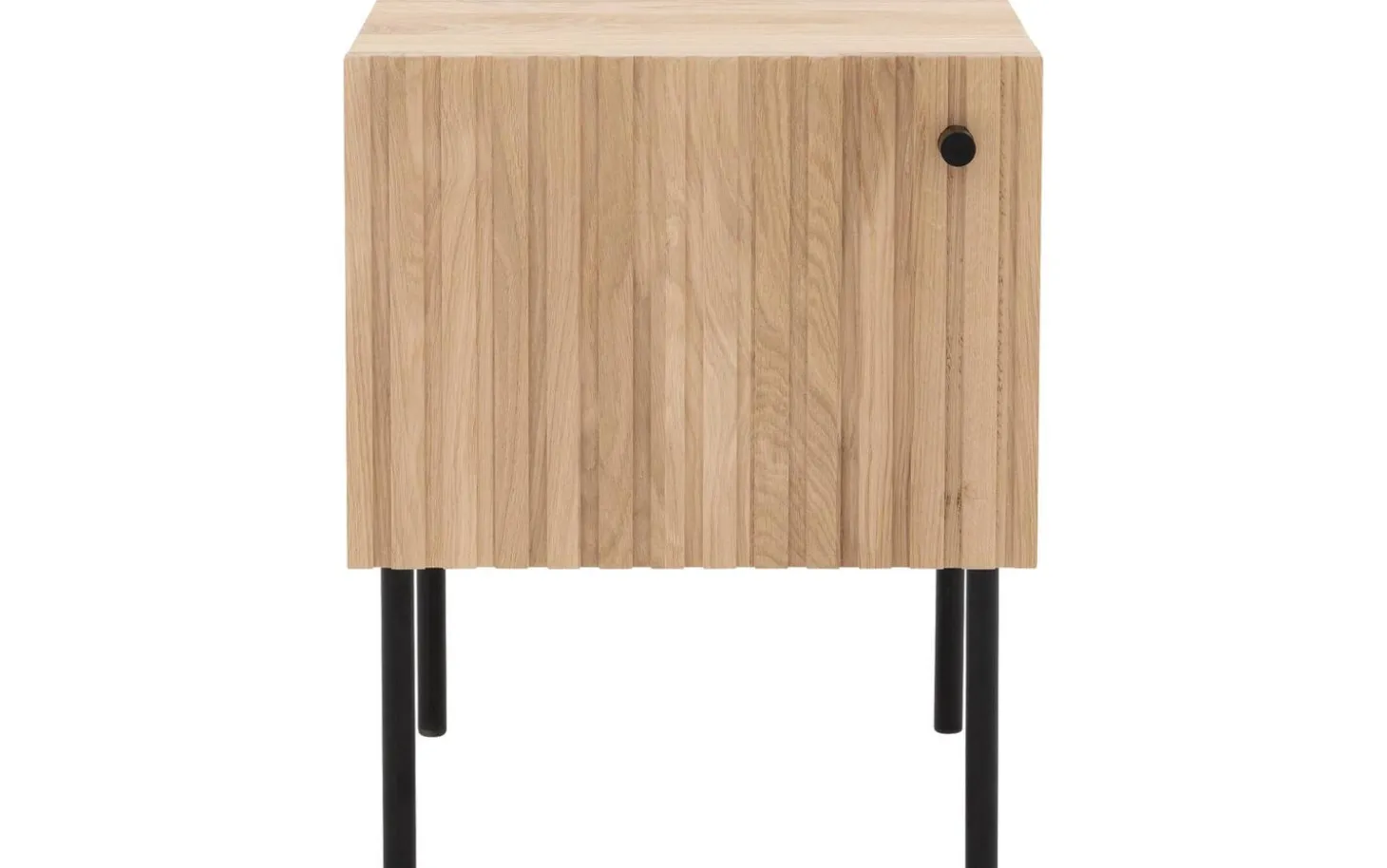 Das Nachtschränkchen Capelli besticht durch sein modernes Design. Ein besonderes Merkmal dieses Möbelstücks sind die vertikalen Linien im Eichenholz, die in Kombination mit den schwarzen runden Metallfüßen und einem passenden Griff für eine moderne Optik sorgen. Die hohen Füße sorgen für eine räumliche Note und erleichtern zudem das Staubsaugen unter dem Nachtschränkchen.