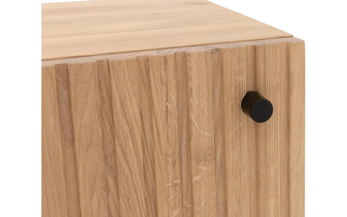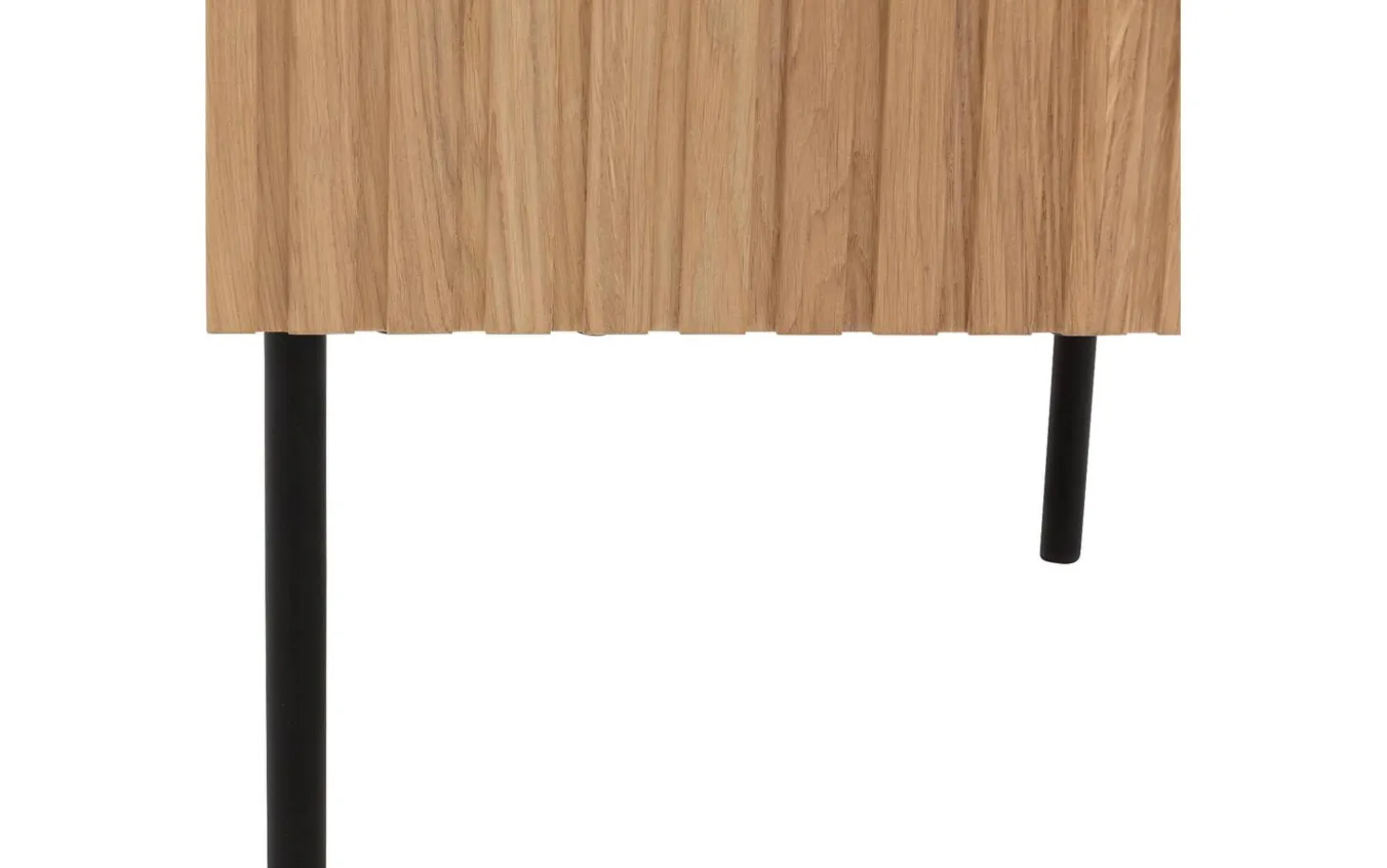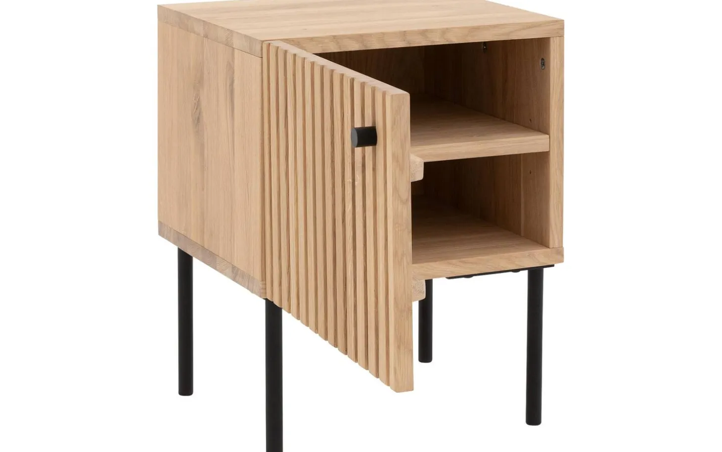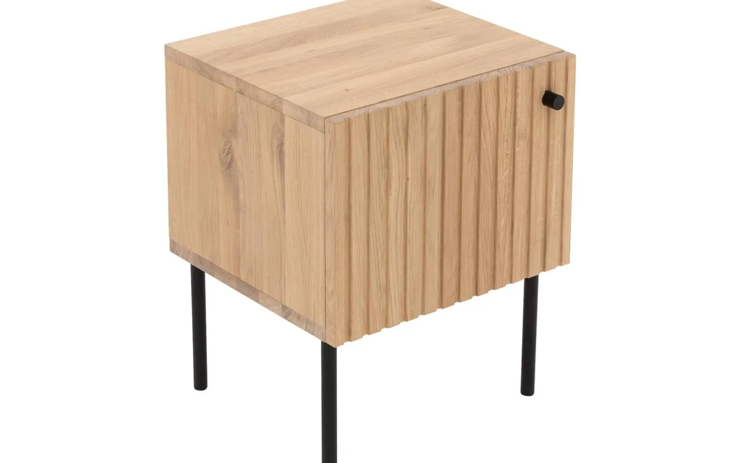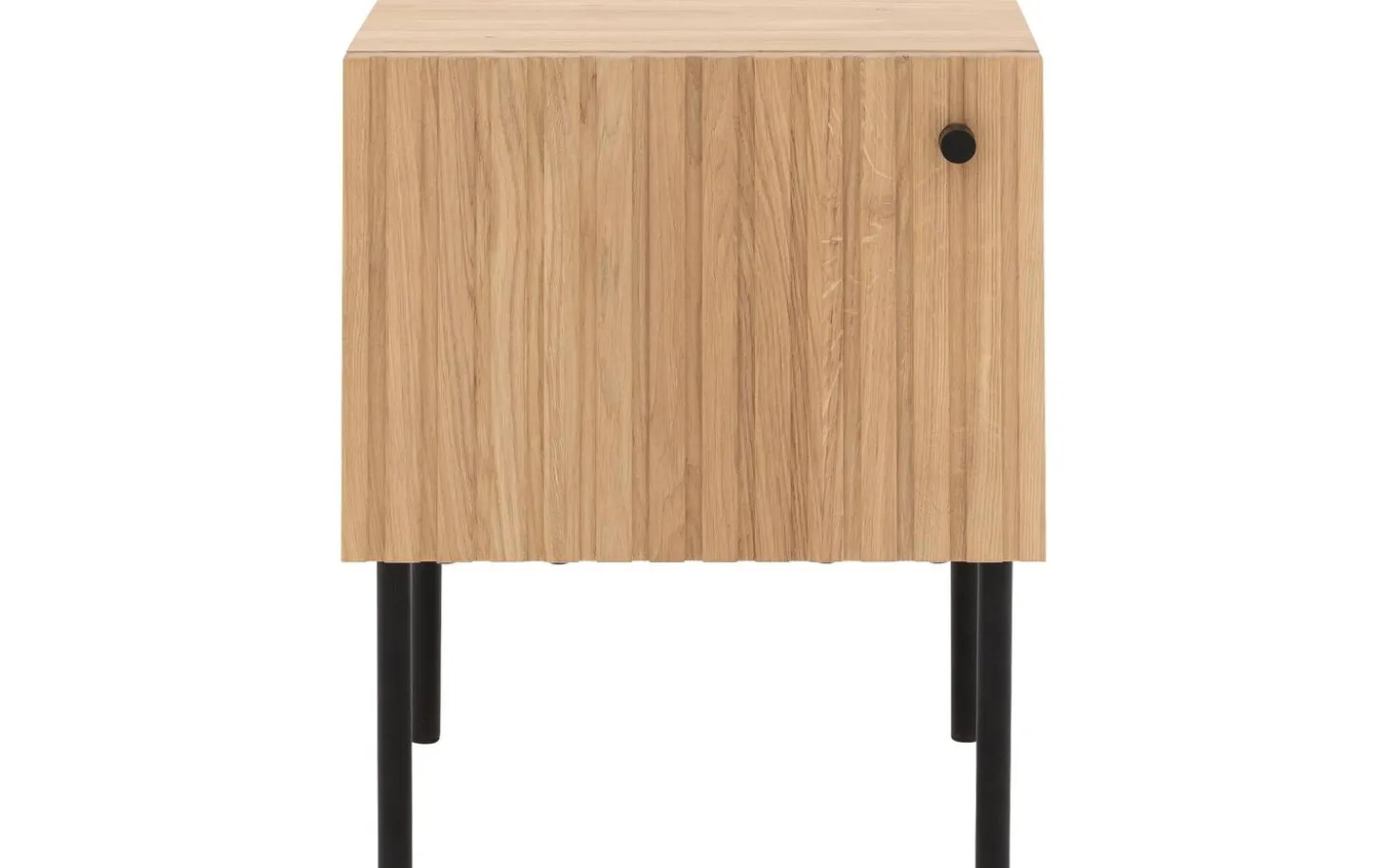 Das Nachtschränkchen Capelli besticht durch sein modernes Design. Ein besonderes Merkmal dieses Möbelstücks sind die vertikalen Linien im Eichenholz, die in Kombination mit den schwarzen runden Metallfüßen und einem passenden Griff für eine moderne Optik sorgen. Die hohen Füße sorgen für eine räumliche Note und erleichtern zudem das Staubsaugen unter dem Nachtschränkchen.