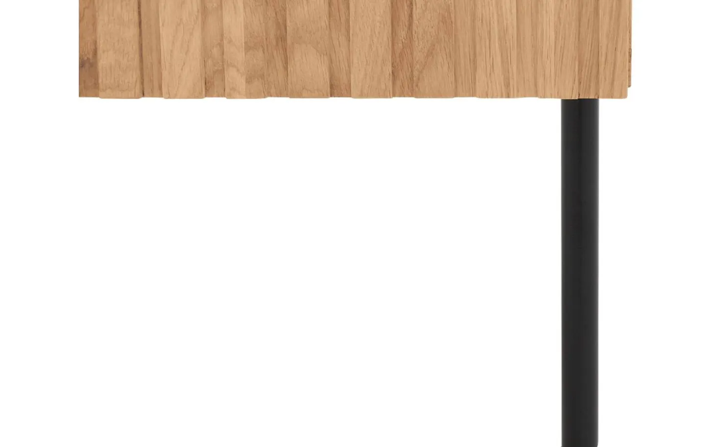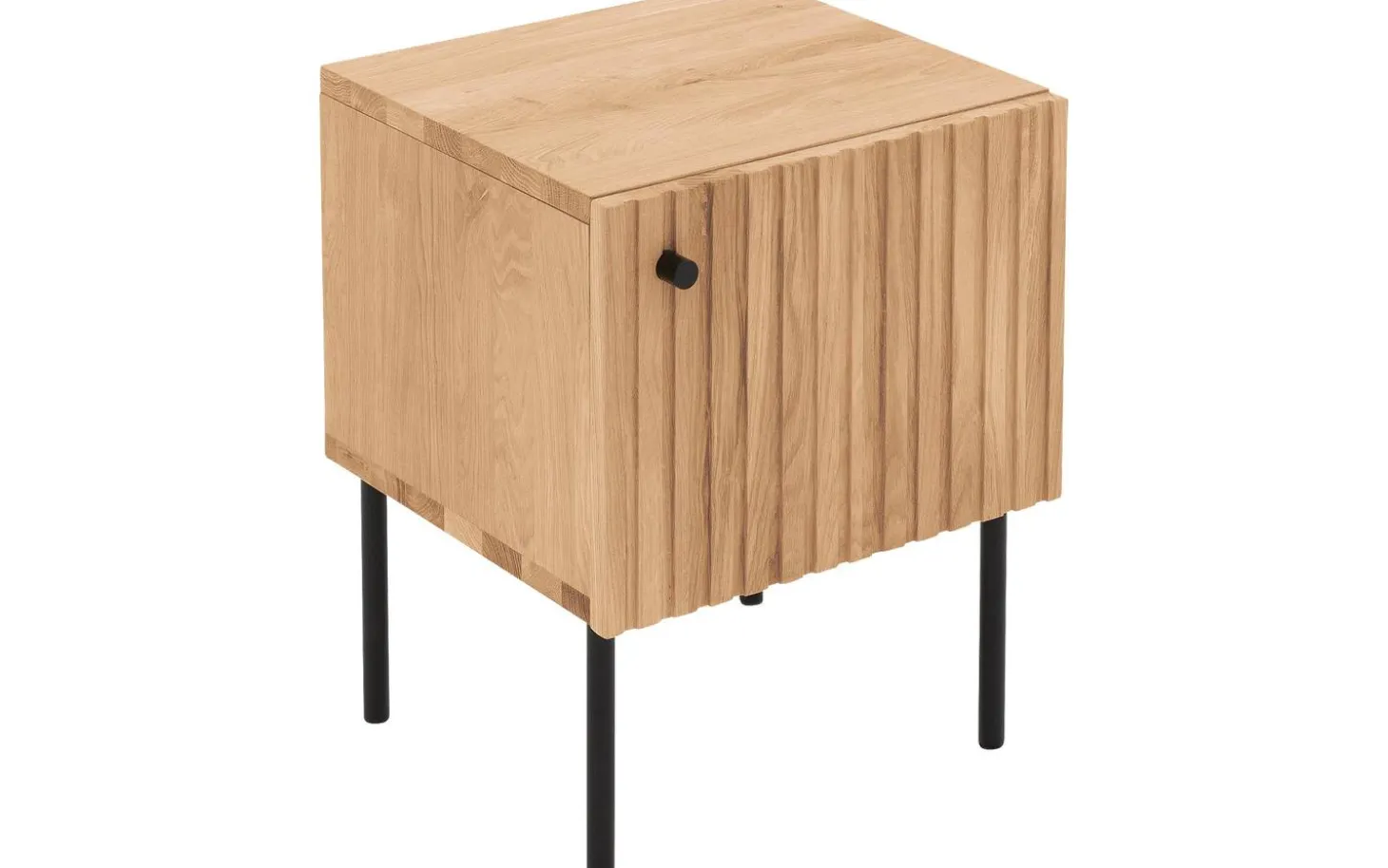 Nachtkastje Capelli heeft een modern design. Bijzonder aan het ontwerp zijn de verticale lijnen in het eikenhout. Dit geeft het nachtkastje in combinatie met de zwarte metalen ronde poten en het bijpassende handgreepje een moderne uitstraling. De hoge poten geven een ruimtelijke look en maken het schoonmaken onder het nachtkastje gemakkelijk.