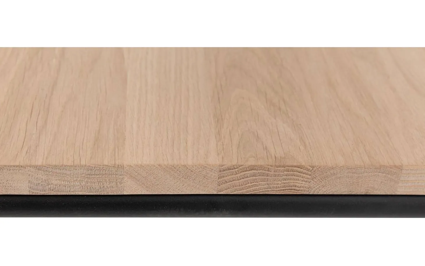 Die Tischplatte ist aus massivem Eichenholz im Naturton mit einer unbehandelten Oberfläche gefertigt. Dadurch behält das Holz seine authentische Ausstrahlung mit natürlichen Ästen und Farbunterschieden. Das offene Fach unter der Platte bietet praktischen zusätzlichen Stauraum.