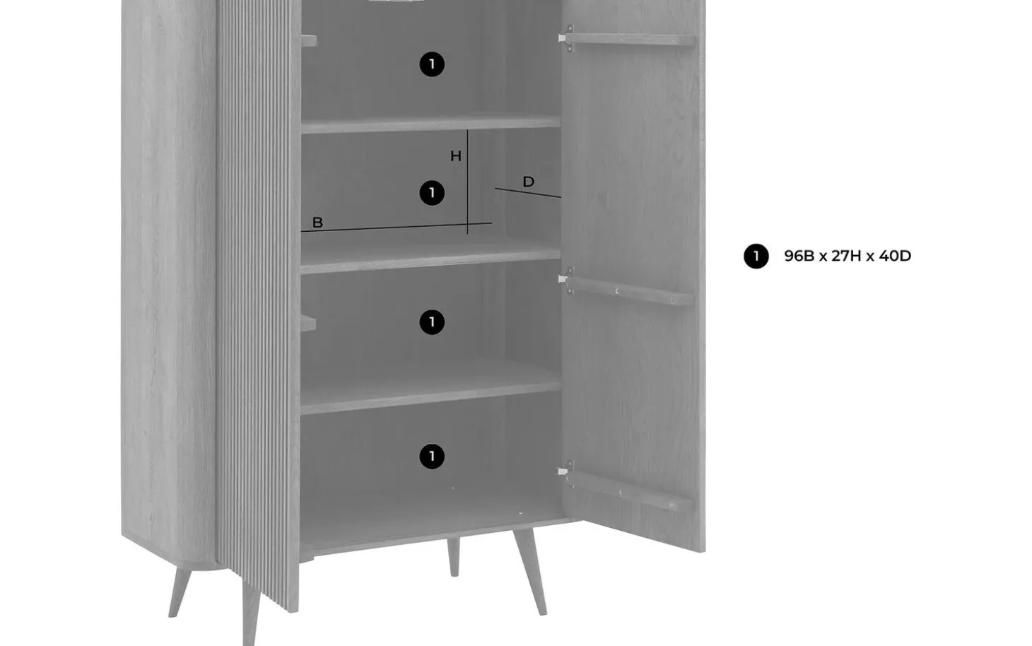 Das clevere Push-to-Open-System sorgt für klare Linien ohne Griffe. Ein leichter Druck auf die Tür genügt, um Zugang zu den vier geräumigen Fächern zu erhalten. Ideal zur Aufbewahrung von Kleidung, Büchern oder anderen persönlichen Gegenständen.