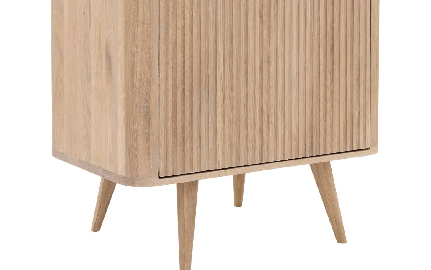 Die warme Eichen-Verarbeitung mit weißem Öl verleiht diesem Aufbewahrungsschrank eine natürliche, beruhigende Ausstrahlung. Das Retro-Design mit runden Formen fügt Verspieltheit zu Ihrem Interieur hinzu, ohne aufdringlich zu werden. Perfekt freistehend platziert im Wohnzimmer, Schlafzimmer oder Arbeitszimmer.