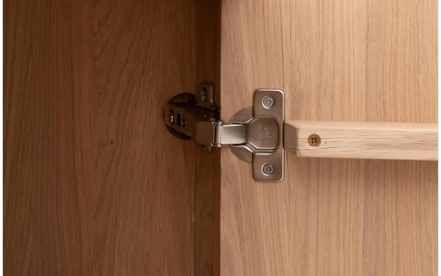 Die weiße Öl-Oberfläche betont die natürliche Holzmaserung und verleiht diesem Eichenschrank eine sanfte, warme Ausstrahlung. Das Push-to-Open-System öffnet die Türen mit leichtem Druck, was für einfache Bedienung sorgt, ohne die schlichten Linien zu stören.