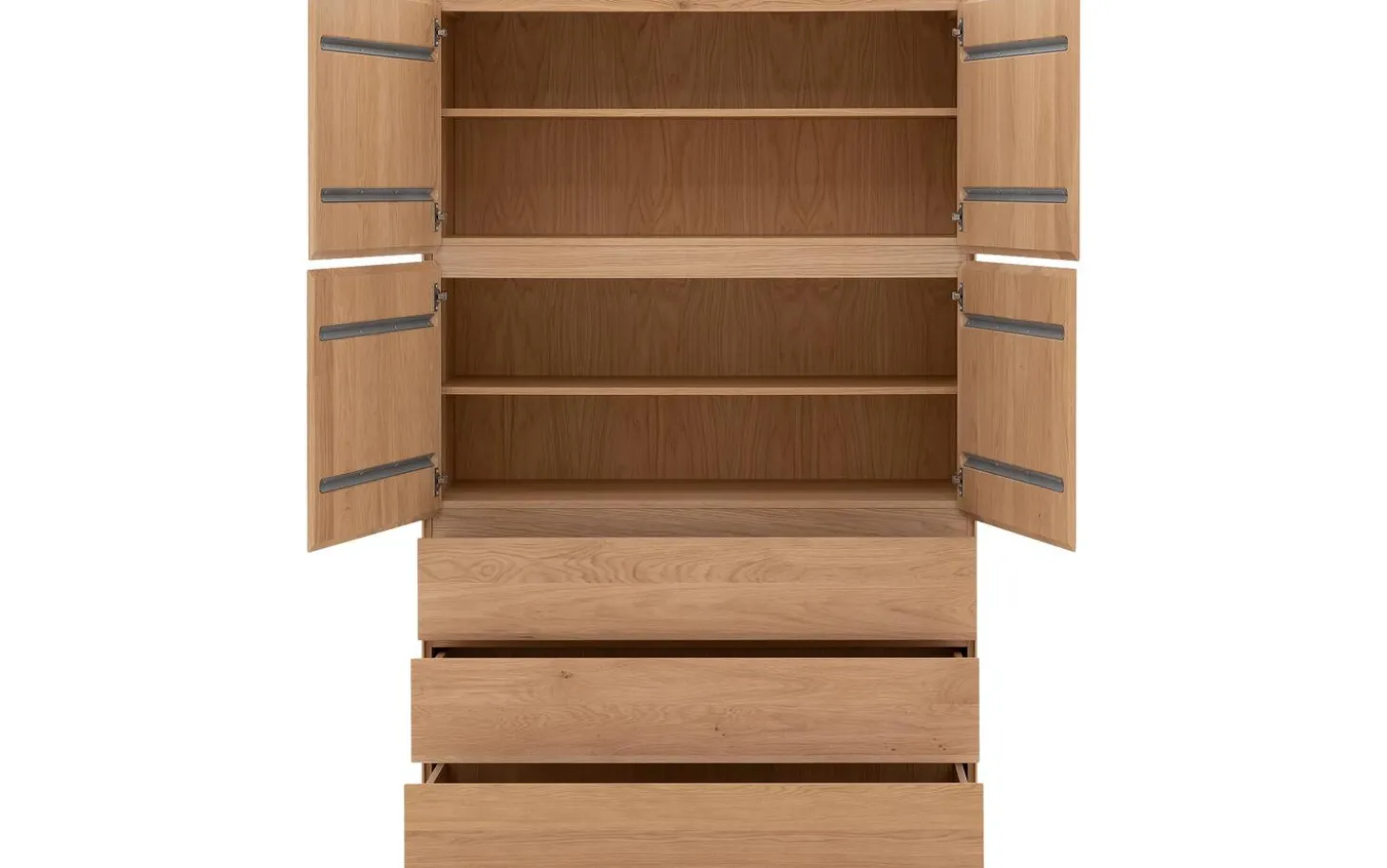 Die Kombination aus vier Türen und drei Schubladen gibt Ihnen alle Freiheit, Ihre Sachen übersichtlich zu verstauen. Von Kleidung bis zu wichtigen Dokumenten – alles bekommt seinen eigenen Platz hinter den stilvollen Eichentüren mit weißer Oberfläche.