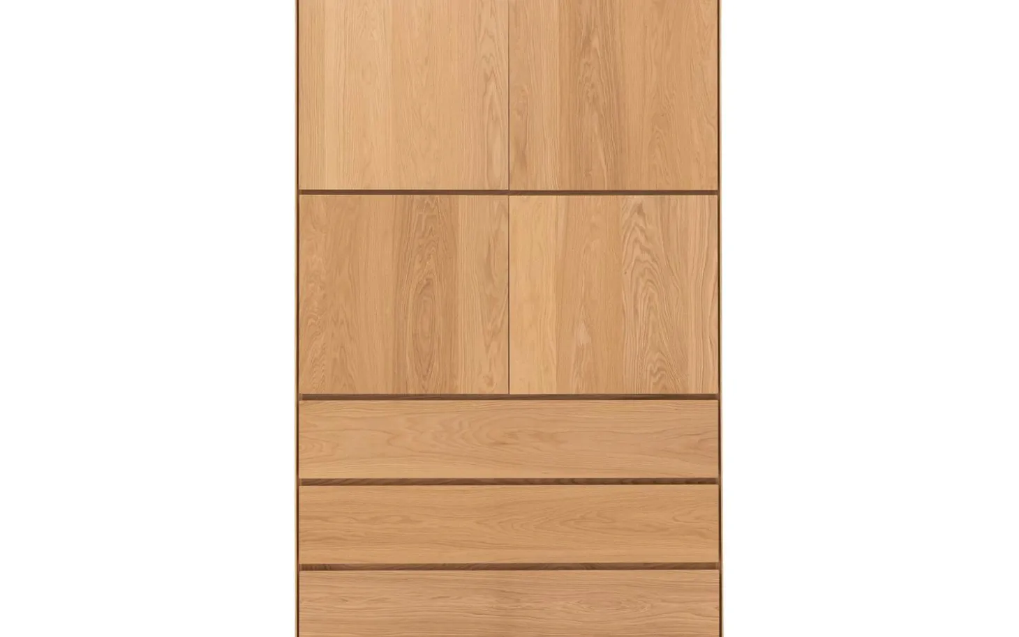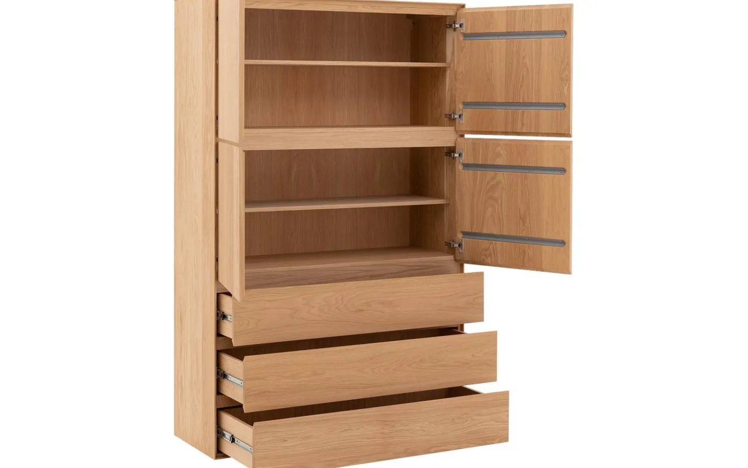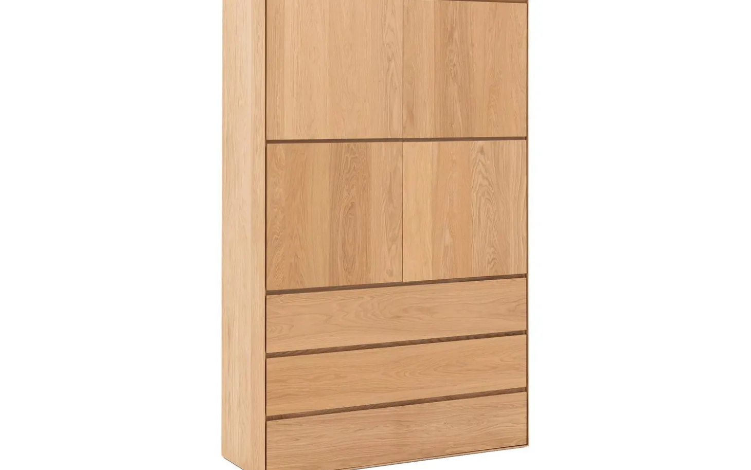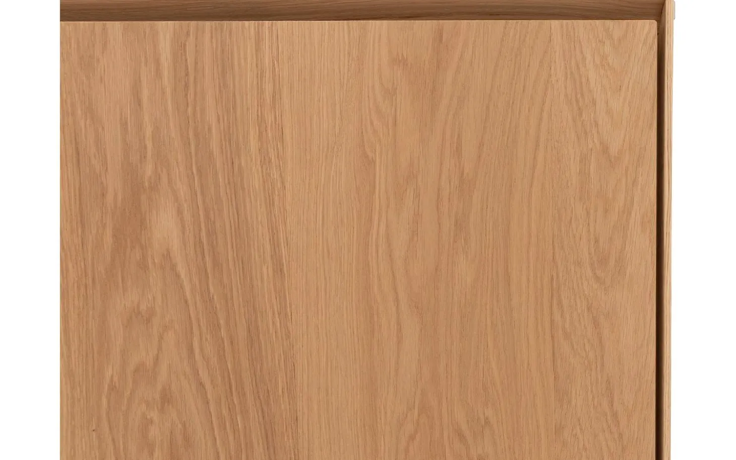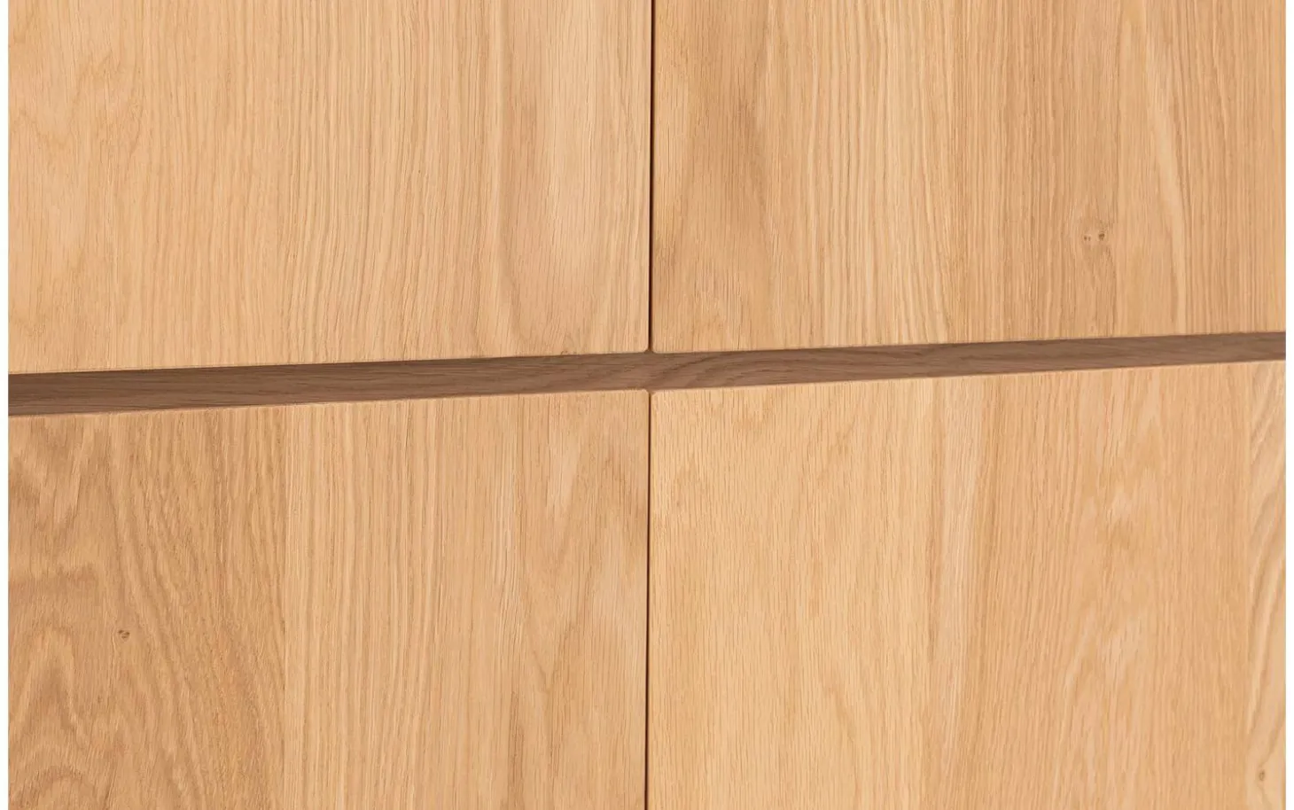 Aufbewahrungsschrank Vic ist aus hochwertigem Eichenholz mit einem schützenden Soft-Touch-Lack gefertigt. Diese langlebige Oberfläche verleiht nicht nur eine schöne helle Farbe, sondern schützt das Holz auch vor täglicher Abnutzung. Die vier Türen und drei Schubladen bieten reichlich Möglichkeiten, um Gegenstände organisiert zu verstauen.