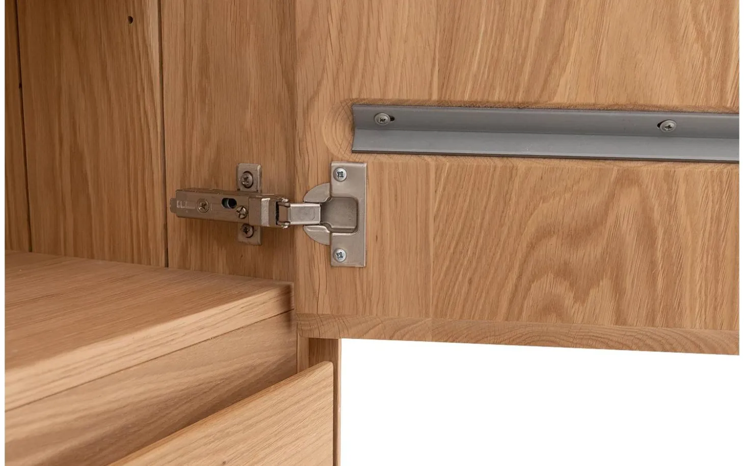 Das integrierte Soft-Closing-System sorgt dafür, dass Türen und Schubladen immer sanft und geräuschlos schließen. Keine harten Schläge mehr, was nicht nur angenehm in der Nutzung ist, sondern auch Ihr Möbelstück schützt. Die klare Formgebung ohne Griffe verstärkt die minimalistische Ausstrahlung.