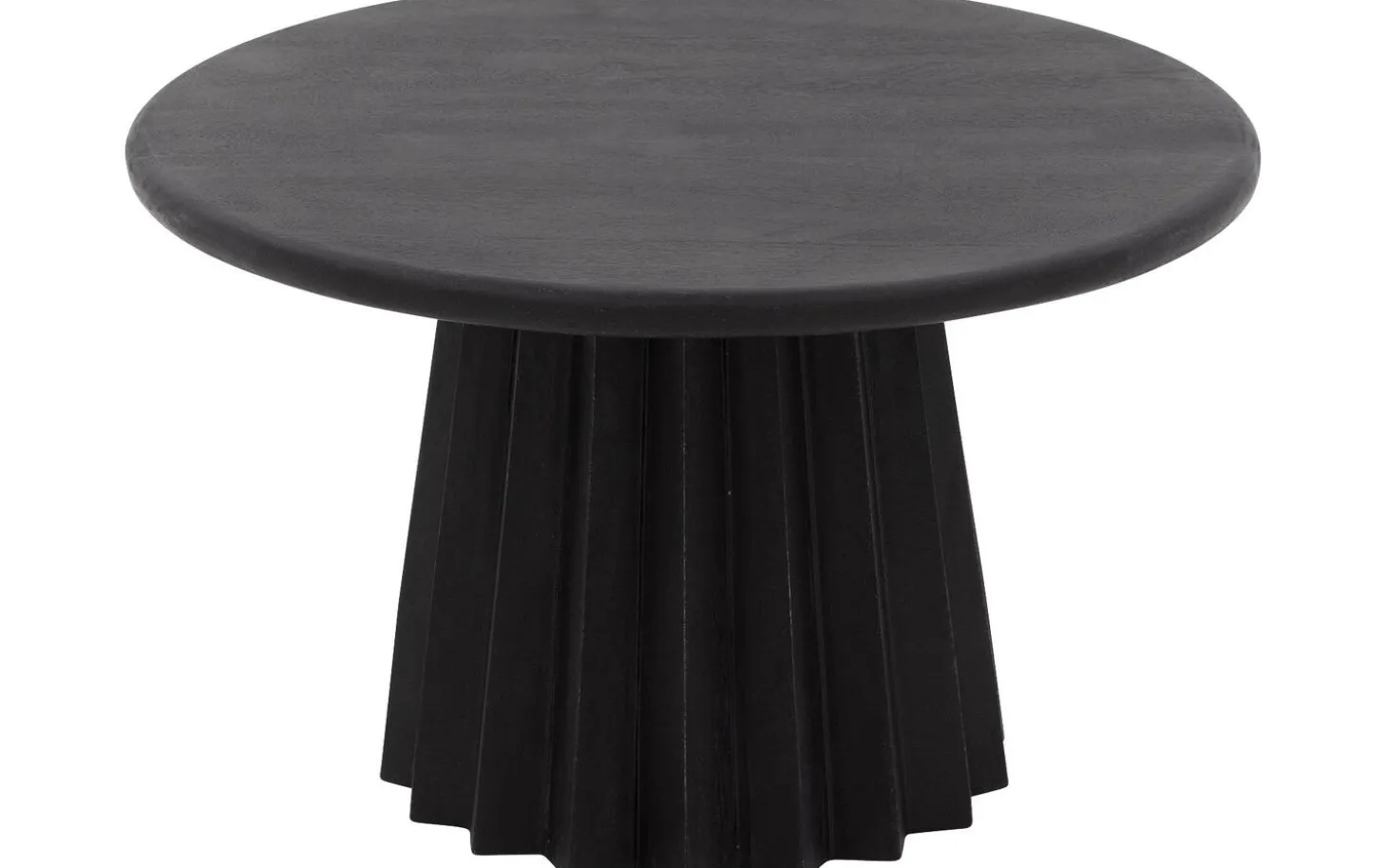 Couchtisch Felicia hat eine schöne runde Form, die für eine sanfte, einladende Atmosphäre sorgt. Der Säulenfuß aus schwarzem Mangoholz verleiht eine klare Basis, während die runde Tischplatte das Ganze freundlich hält. Ideal für gemütliche Momente im Wohnzimmer.