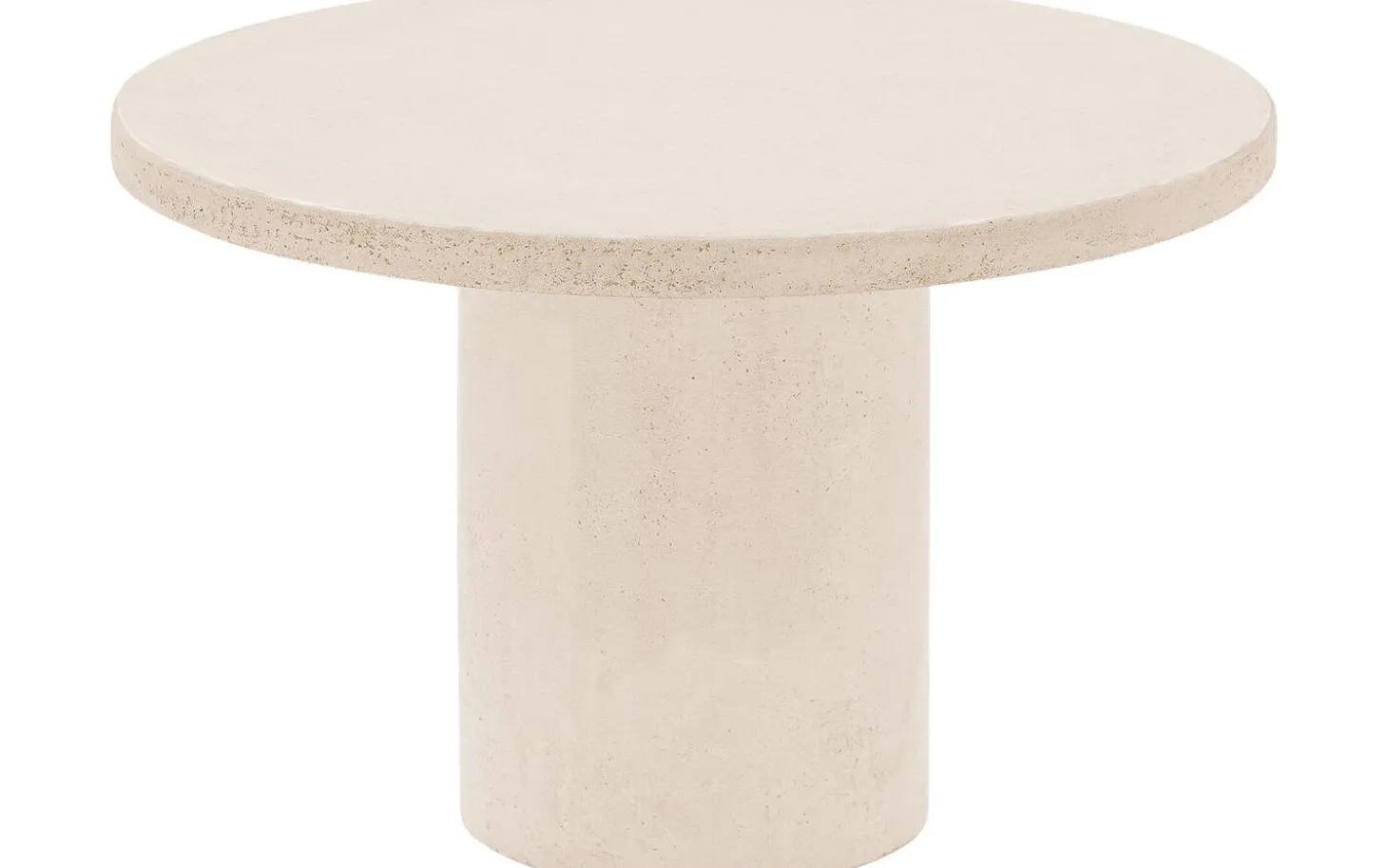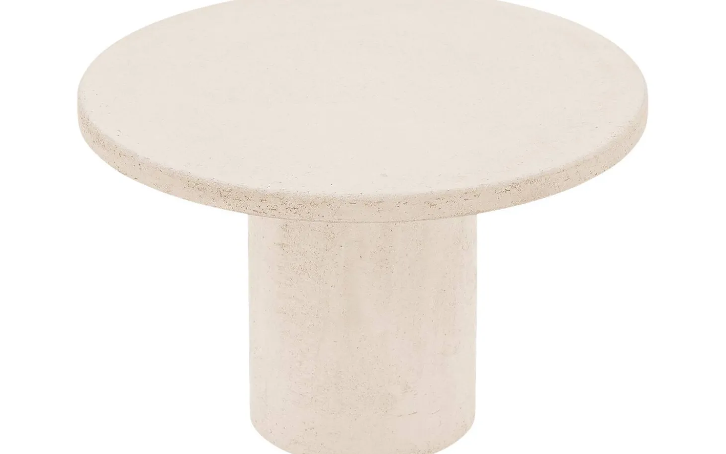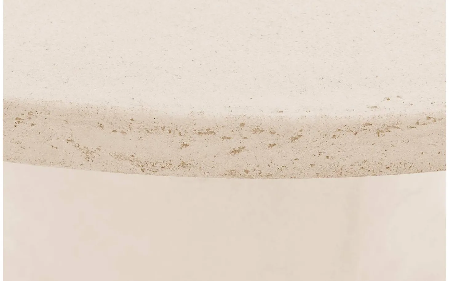 Stone hat eine runde Form, die Sanftheit in jedes Wohnzimmer bringt. Der Säulenfuß aus Beton in derselben beigen Farbe wie die Tischplatte sorgt für eine robuste und markante Basis. Die Oberfläche in Betonoptik verleiht dem Tisch eine industrielle Note mit authentischen Unregelmäßigkeiten.