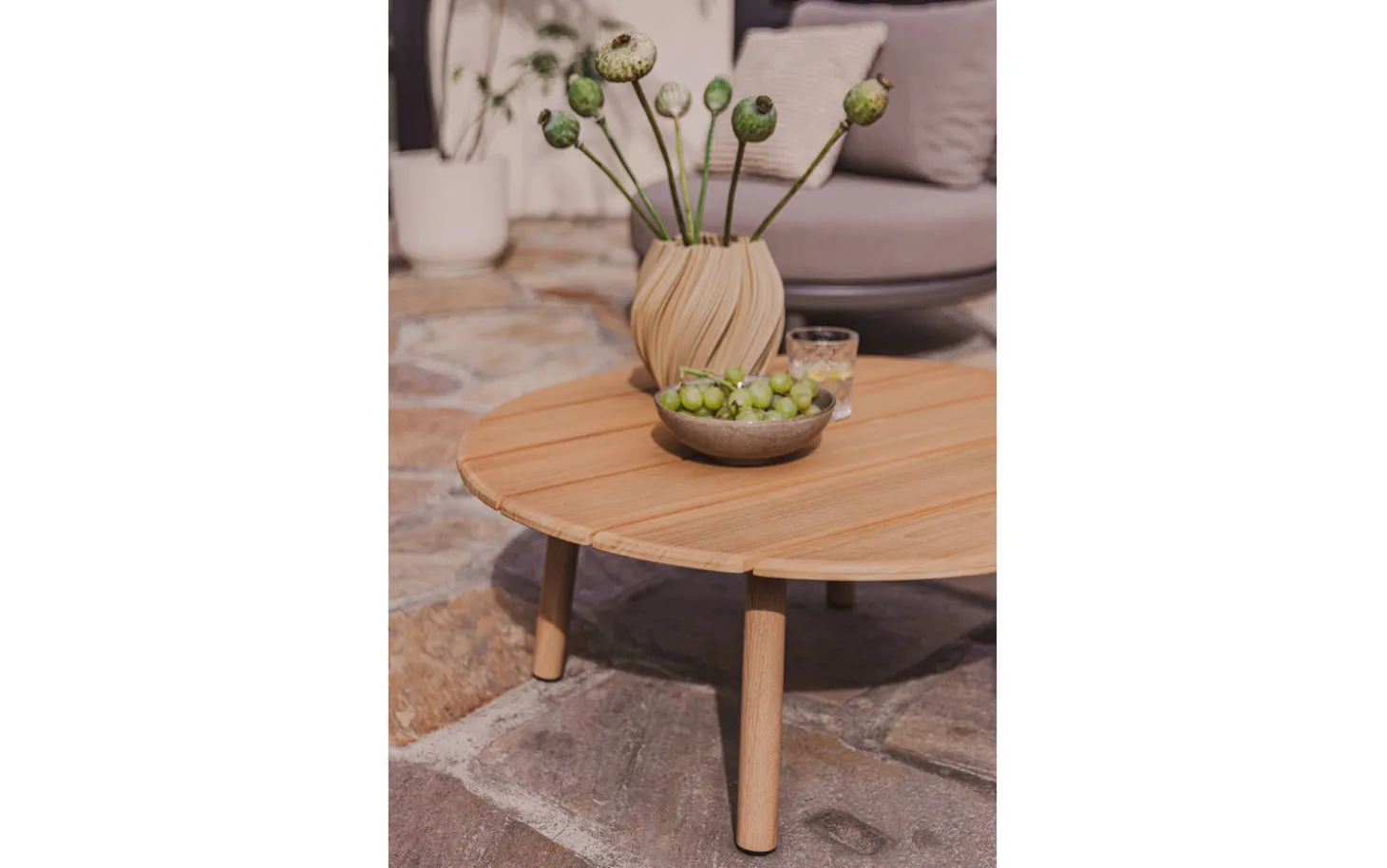 Compacte ronde buitensalontafel Bari heeft een klassiek, strak silhouet en een warme naturel teakkleur. De teak olie afwerking benadrukt de houttekening en houdt de kleur warm. Een tijdloze keuze voor elk terras of balkon.