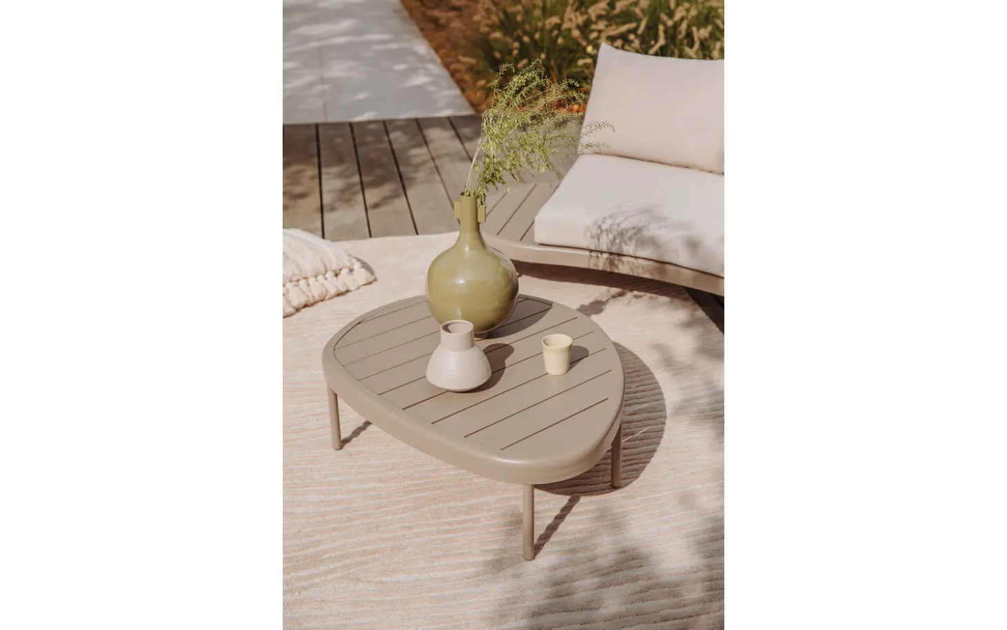 Bruine salontafel voor buiten Pien brengt warmte en functionaliteit naar je terras of tuin. Deze compacte tuintafel van aluminium combineert een stoer industrieel design met praktisch gebruiksgemak. De geborstelde taupe afwerking geeft het aluminium een natuurlijke, rustige uitstraling die mooi past bij verschillende tuinstijlen.