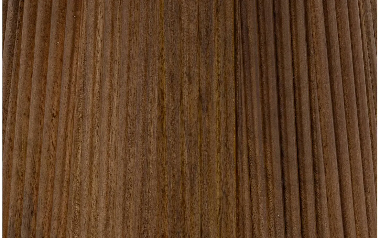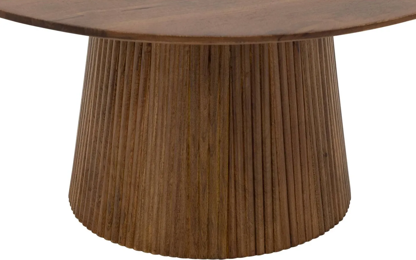 Salontafel Zaro heeft een ronde vorm die de ruimte zacht en open houdt. Het mangohouten blad in warme bruintinten en de gelakte afwerking geven de tafel een natuurlijke en tijdloze uitstraling. De ronde houten poten sluiten mooi aan bij het organische karakter van het ontwerp.
