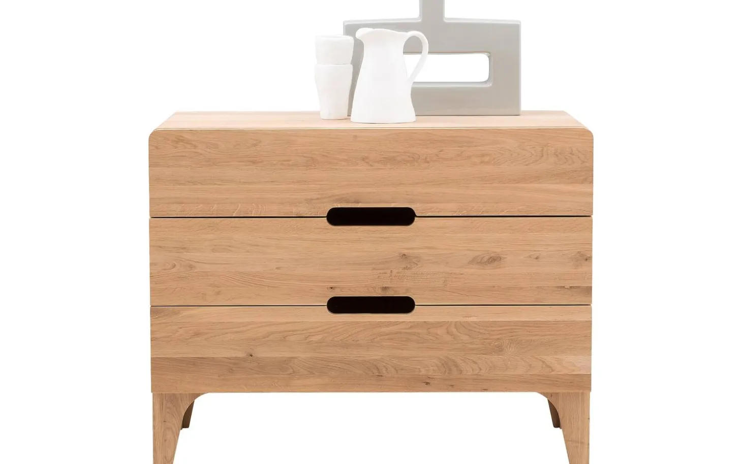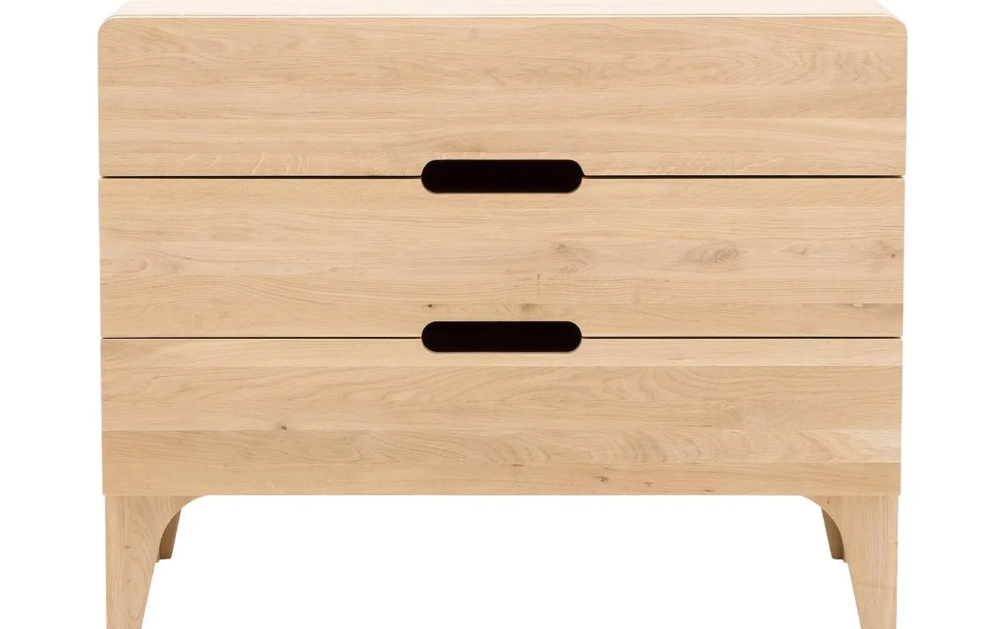 Curve ist eine Kommode mit unverwechselbarem Charakter. Die Kommode mit 3 Schubladen wird mit größter Sorgfalt aus langlebigem Eichenholz gefertigt. Die einzigartigen runden Formen sind ein Beweis großartigen fachmännischen Könnens. Die Schubladen des Schränkchens sind außerdem mit einem Soft-Closing-System ausgestattet. Dieses System gewährleistet ein leichtes und geräuschloses Schließen der Schubladen. Schaffen Sie jetzt die perfekte gemütliche Atmosphäre in Ihrem Schlafzimmer und kombinieren Sie die Kommode Curve mit anderen Möbelstücken aus der Serie Curve.