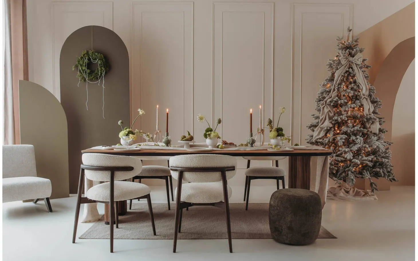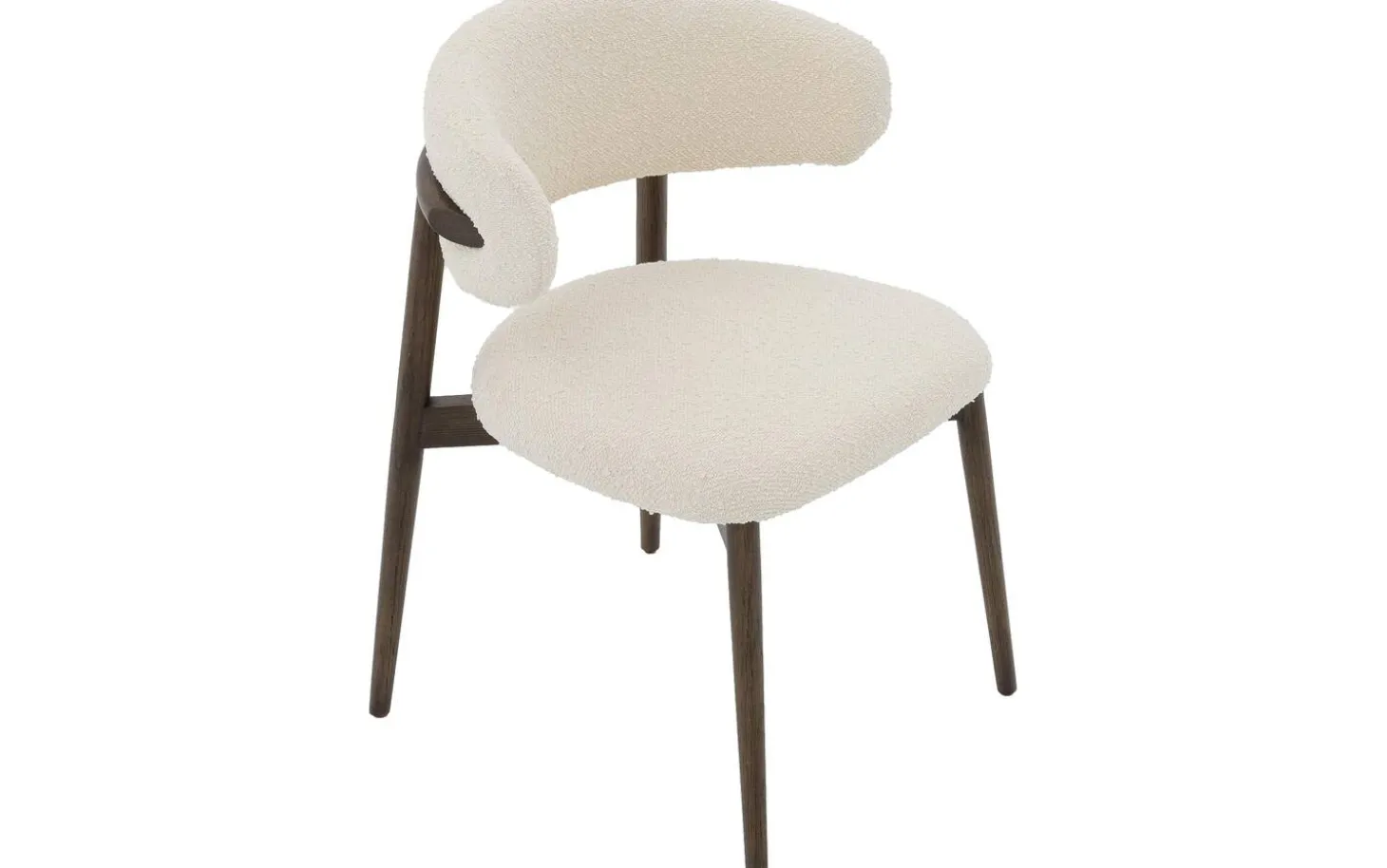 Der beige Bouclé-Stoff verleiht dem Esszimmerstuhl Diede eine weiche Textur, die zum Anfassen einlädt. Der Stoff hat eine verspielte Struktur, die dem Stuhl Tiefe und Charakter verleiht. Die dunkelbraunen Holzbeine bilden einen schönen Kontrast zur hellen Polsterung.
