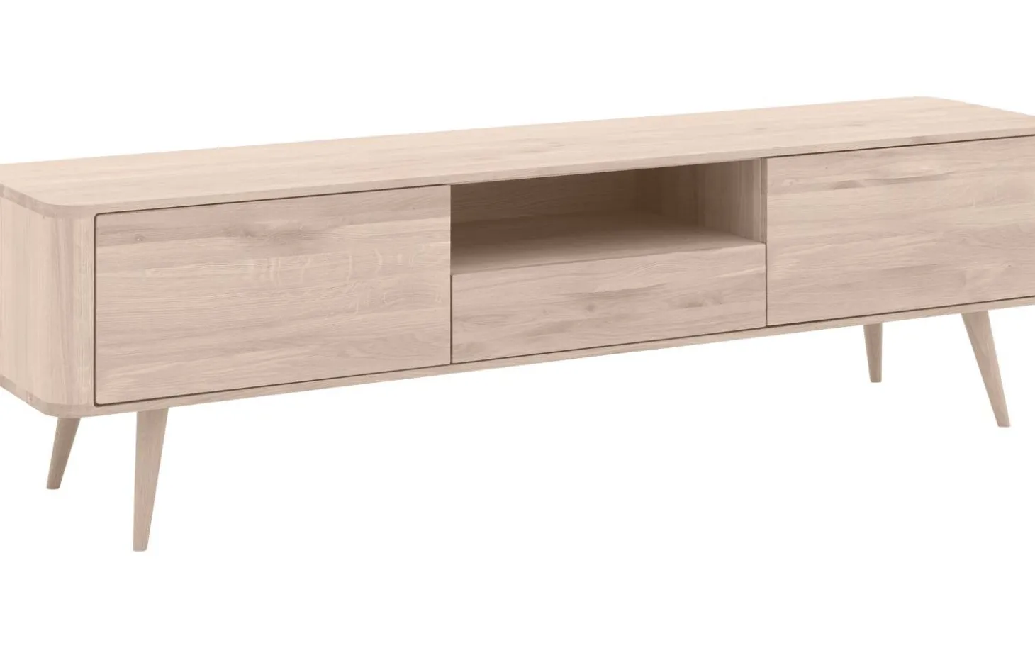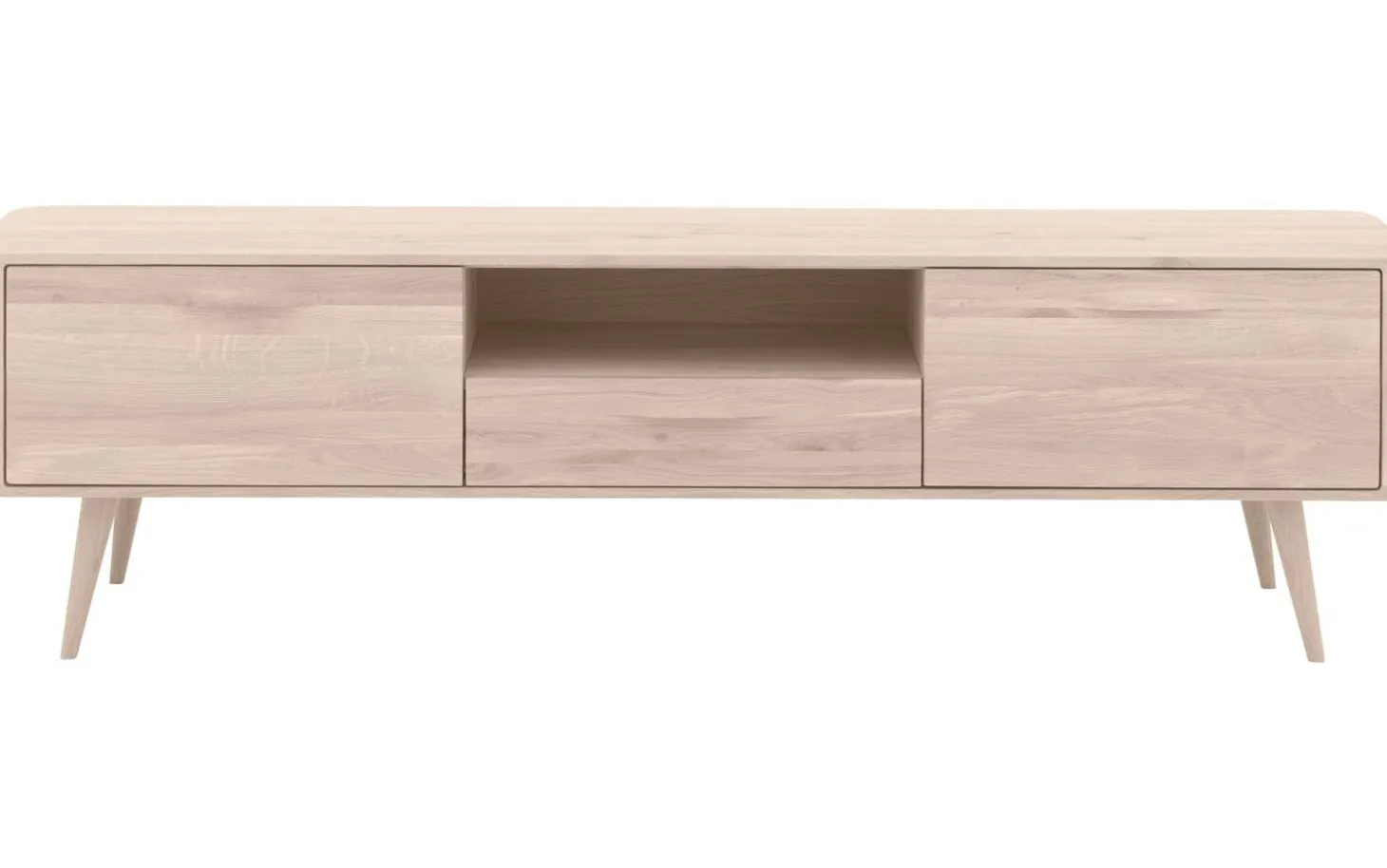TV Möbel Bjarte kombiniert Retro-Charme mit praktischem Stauraum für Ihr Wohnzimmer. Die weit ausladenden Beine und die cremeweiße Eichen-Verarbeitung verleihen diesem nachhaltigen TV Möbel eine trendige Vintage-Ausstrahlung. Mit praktischen Soft-Closing-Türen und Schubladen halten Sie all Ihre Geräte ordentlich organisiert.