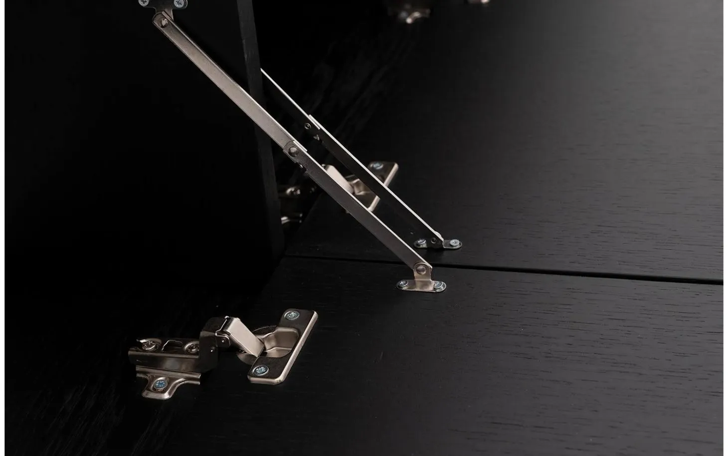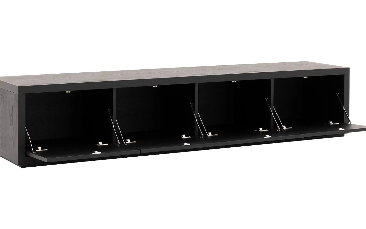 Dieses schwarze Eichen-TV-Möbel kombiniert eine markante Ausstrahlung mit praktischem Stauraum für all Ihre Geräte. Mit dem cleveren Push-to-Open-System bleiben die klaren Linien erhalten, während die natürliche Holzmaserstruktur für zeitlose Eleganz sorgt. Ein echter Blickfang, der Ihrem Wohnzimmer sofort Charakter verleiht.