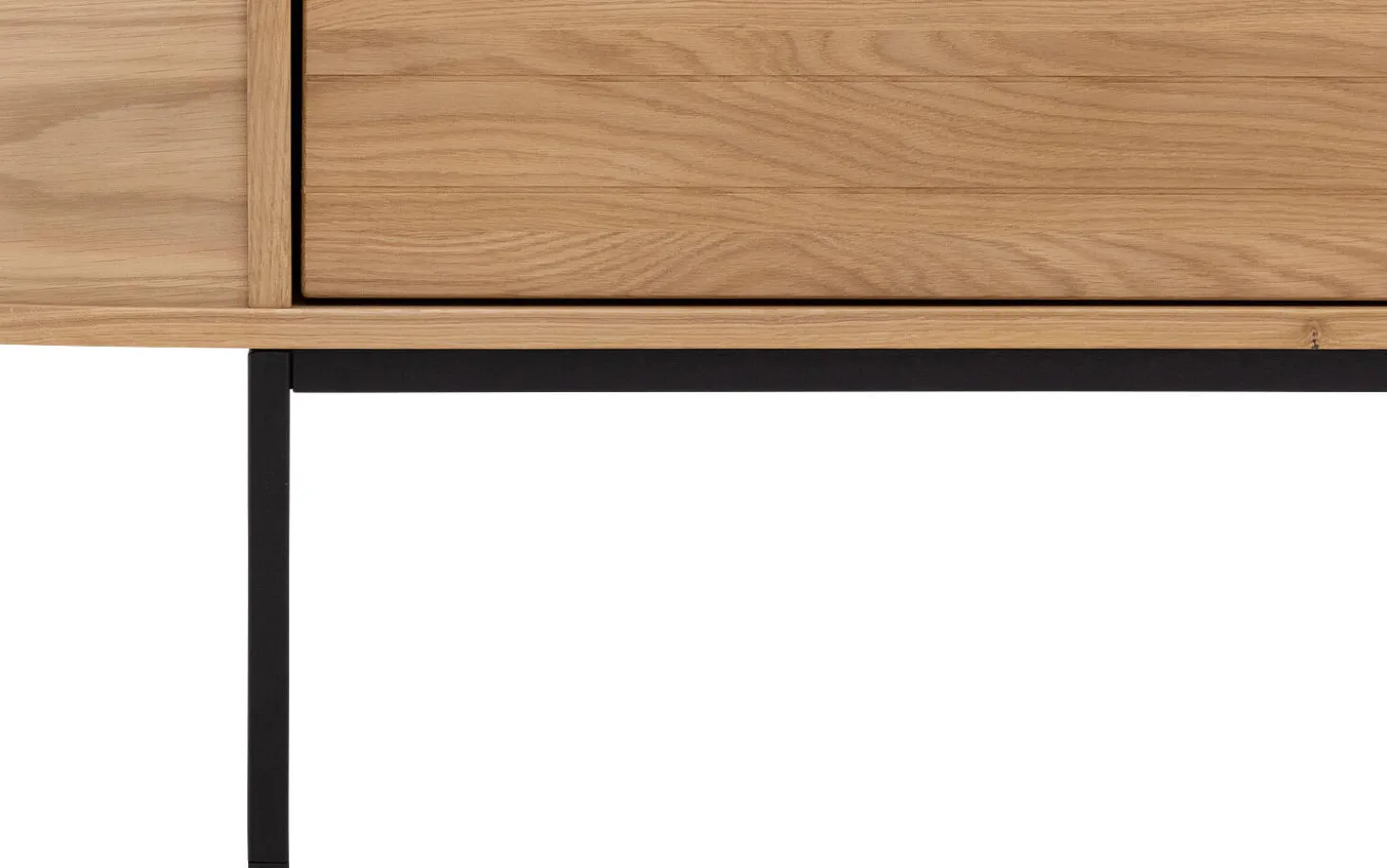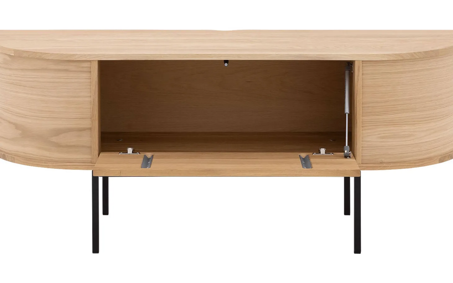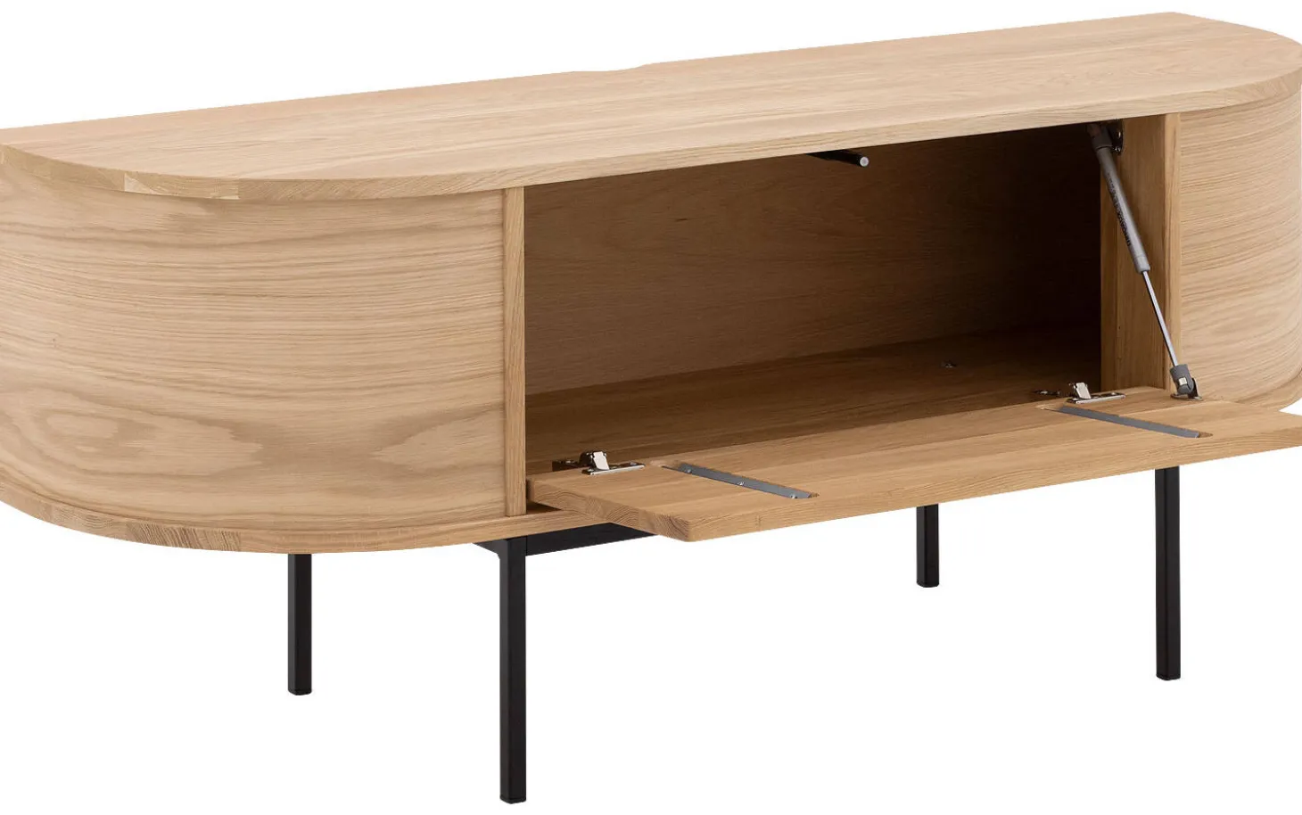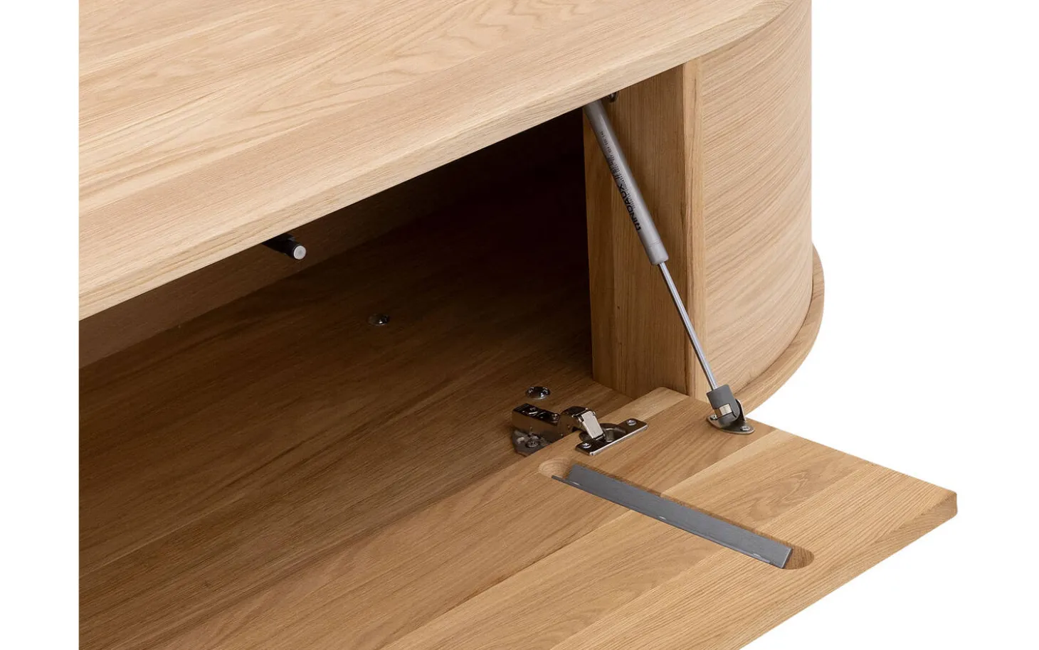 Dieses Eichen-TV-Möbel hat eine praktische Klappe, die dank des Push-to-Open-Systems geschmeidig öffnet. Keine sichtbaren Griffe, aber alle Annehmlichkeiten. Die Kombination aus massivem Eichenholz und Eichenfurnier mit Soft-Touch-Lack verleiht eine warme, natürliche Ausstrahlung, die schön altert.