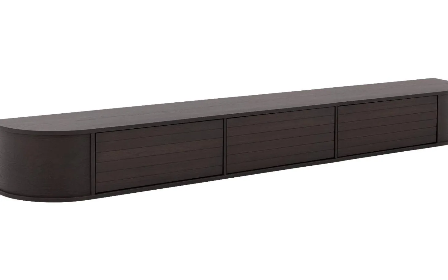 Das TV-Möbel Delfina fällt durch seine sanften Rundungen und warme Eichenfarbe auf. Das hängende Design verleiht Ihrem Wohnzimmer eine moderne, luftige Ausstrahlung. Die vertikal gestreiften Türen und subtilen schwarzen Akzente machen dieses Möbel zu einem echten Blickfang an der Wand.