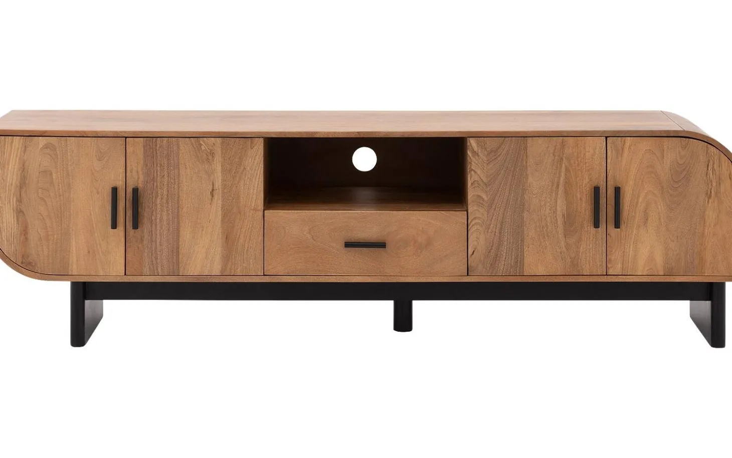 Staand tv meubel Fabian combineert warm mangohout met een eigenzijds asymmetrisch design. Het natuurlijke hout met zachte lakafwerking geeft jouw woonkamer direct een gezellige en moderne uitstraling. Met handige opbergruimte achter de vier deuren en een open vak blijft alles netjes opgeborgen, terwijl je apparatuur via de kabeldoorvoer slim kunt aansluiten.
