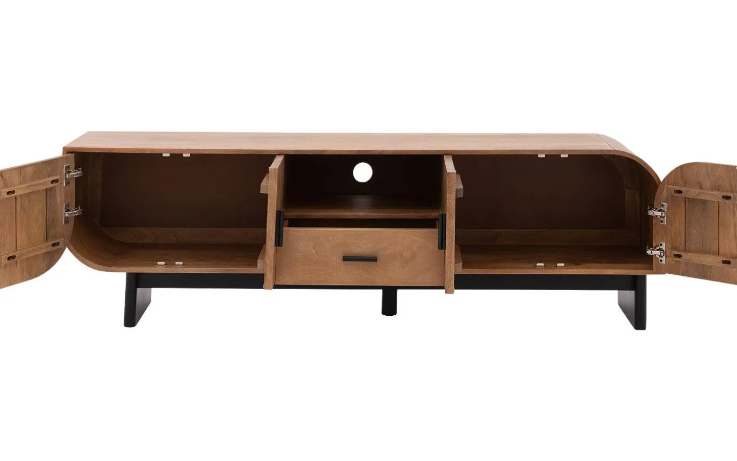 Achter de vier deuren vind je volop ruimte voor je apparatuur, spelcomputers en andere spullen die je liever uit het zicht houdt. In het open vak kun je je decoder of spelcomputer kwijt, zodat de afstandsbediening altijd werkt. De handige kabeldoorvoer in de achterwand zorgt ervoor dat alle snoeren netjes weggewerkt blijven.