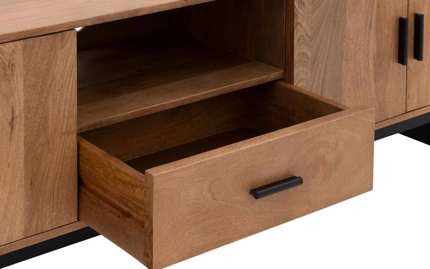 Stijlvolle details van dit bruine tv meubel van mangohout