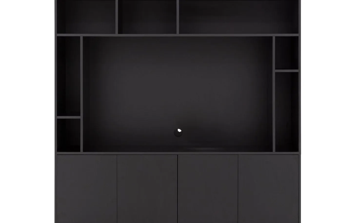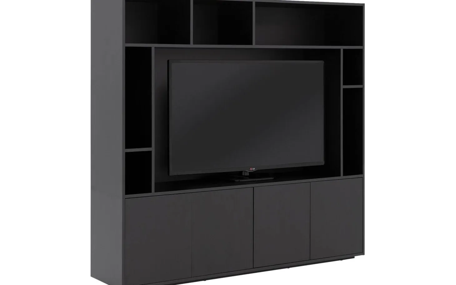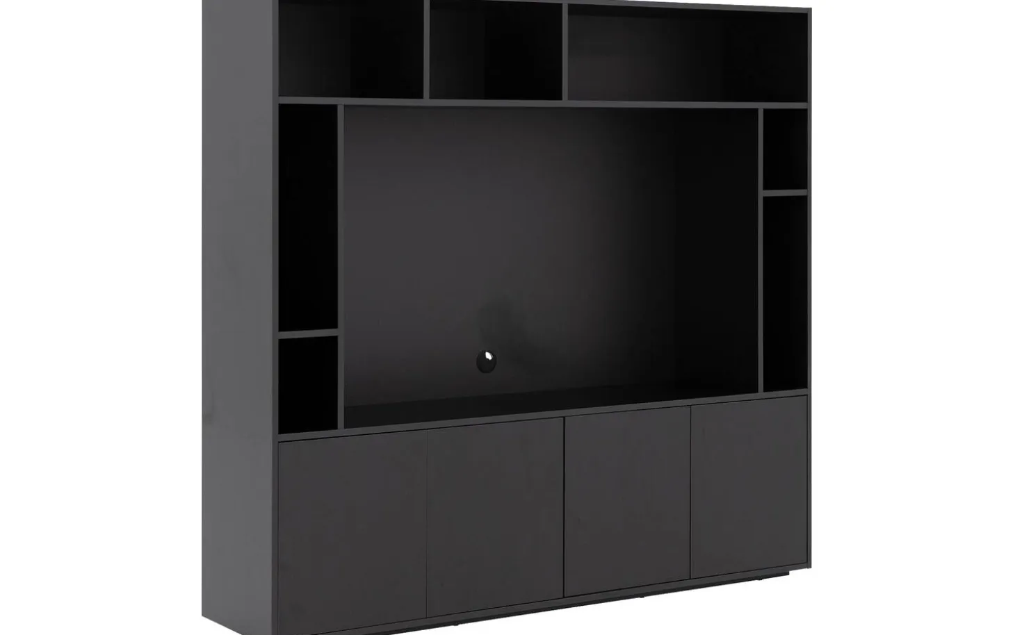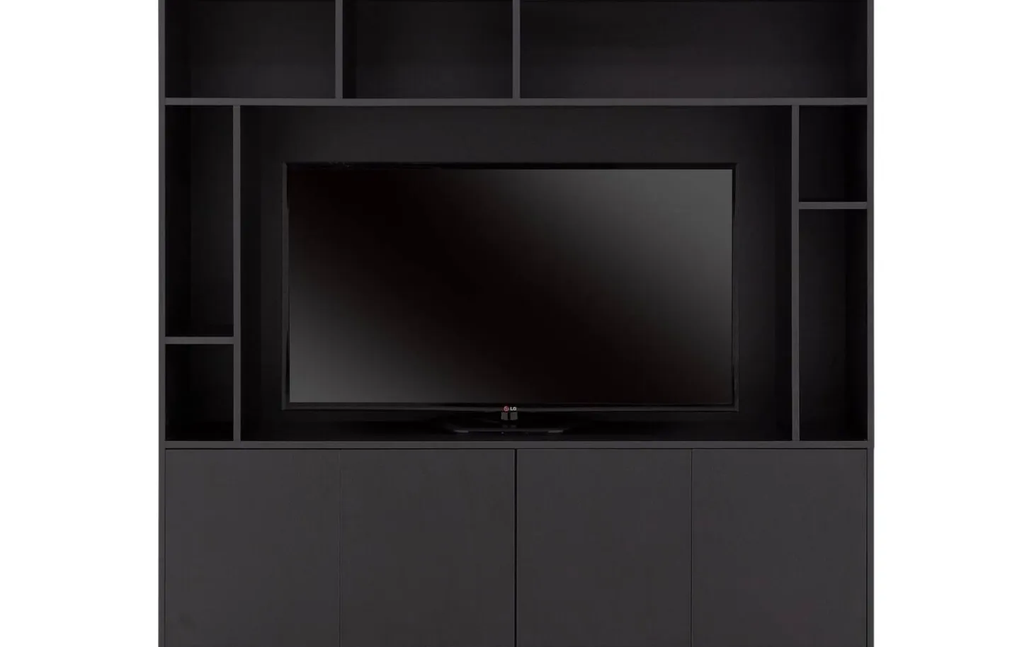 TV meubel Madrid maakt indruk met zijn royale formaat en strakke zwarte uitstraling. De zeven open vakken geven je alle ruimte voor je mediaspullen, decoratie en favoriete woonaccessoires. Achter de vier deuren berg je spullen netjes op die je liever uit het zicht houdt.